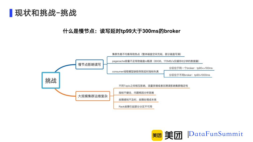 第一部分是慢节点影响读写,这里慢节点参考了HDFS的一个概念,具体定义指的是读写延迟tp99大于300ms的broker。影响慢节点的原因有三个,第一个是集群负载不均衡会导致局部热点,就是整个集群的磁盘空间很充裕或者ioutil很低,但部分磁盘即将写满或者ioutil打满;第二个是pagecache容量不足会导致磁盘IO瓶颈。比如说,80GB的pagecache在170MB/s的写入量下仅能缓存8分钟的数据量。那么如果消费的数据是8分钟前的数据,就有可能触发磁盘读;第三个是consumer线程模型缺陷会导致延时指标的失真。例如当消费的分区处于同一broker时,tp90可能小于100ms,但是当他们处于不同broker时,tp90可能会大于100ms。