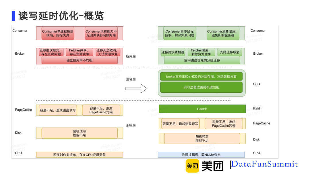 系统层,主要包括三个方面,一是pagecache的容量不足会导致磁盘读写,磁盘读写的性能显著慢于内存,而且容量不足时还会导致pagecache污染,pagecache污染后,磁盘读和回溯读会影响实时读;另一方面,Kafka目前使用的disk主要是HDD,HDD是比较符合顺序读写的场景。但是对于随机读写的场景,它的性能是不足的;最后由于CPU的资源竞争,在美团这边为了提高资源的利用率,IO密集型的服务(比如Kafka)会和CPU密集型的服务(比如实时作业)混布,混布其实是存在资源竞争的,也会影响读写的延迟。