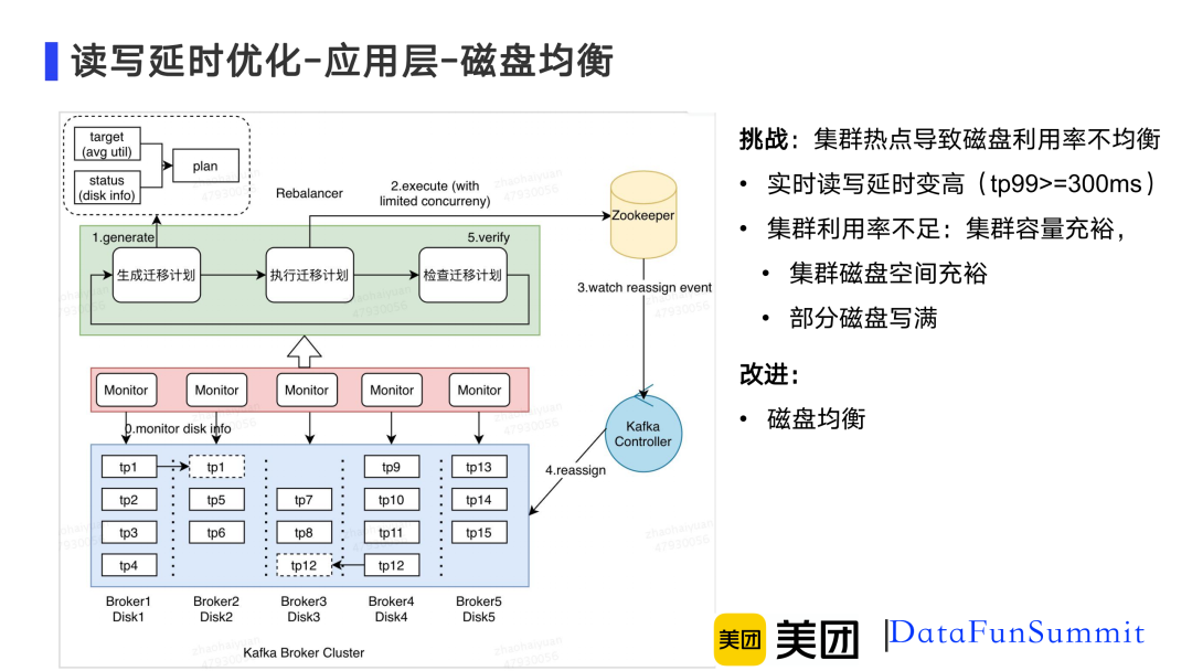 针对这两个问题我们做了基于空闲磁盘优先这样一个分区迁移计算计划,整个计划分为5个点。如图2-2 所示,首先会有一个组件叫rebalancer,rebalancer通过目标的使用率和Kafka monitor组件不断从Kafka broker集群上报上来的当前磁盘的使用状况这两类指标持续生成具体的分区迁移计划,执行迁移计划并检查进度;然后rebalancer会向zookeeper的reassign节点提交刚才生成的迁移计划,Kafka的controller收到这个reassign事件之后会向整个Kafka broker集群提交reassign事件,然后Kafka broker集群让整体磁盘利用率趋于均衡值这样一个目标执行磁盘迁移计划。