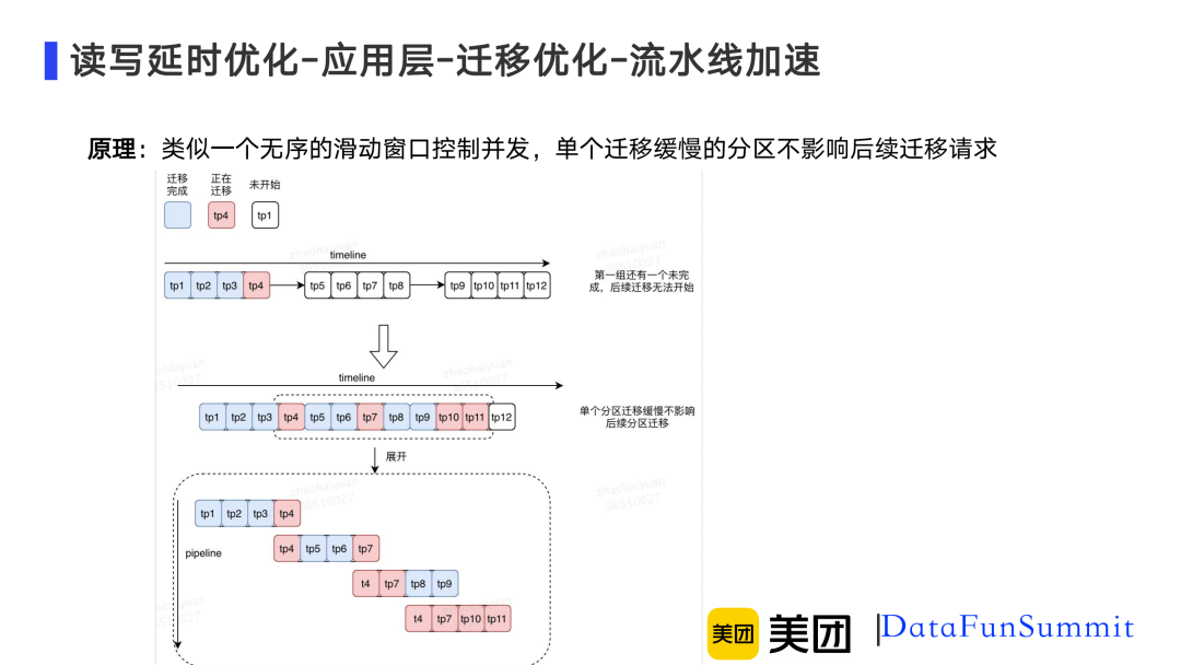 针对长尾分区问题,我们主要是做了流水线加速,如图2-3所示,箭头以上原生Kafka版本只支持按组提交,比如说一批提交了四个分区,当tp4这个分区一直卡着无法完成的时候,后续所有分区都无法继续进行。采用流水线加速之后,即使tp4这个分区还没有完成,当其它三个分区已经完成的时候,后续就可以继续提交新的分区。可以看出在相同的时间内,原有的方案受阻于tp4没有完成后续所有分区都没办法完成,但是在新的方案中,tp4分区已经迁移到tp11分区了。图中虚线代表了一个无序的时间窗口,主要用于控制并发,目的是为了和原有的按组提交的个数保持一致,避免过多的迁移影响读写请求服务。