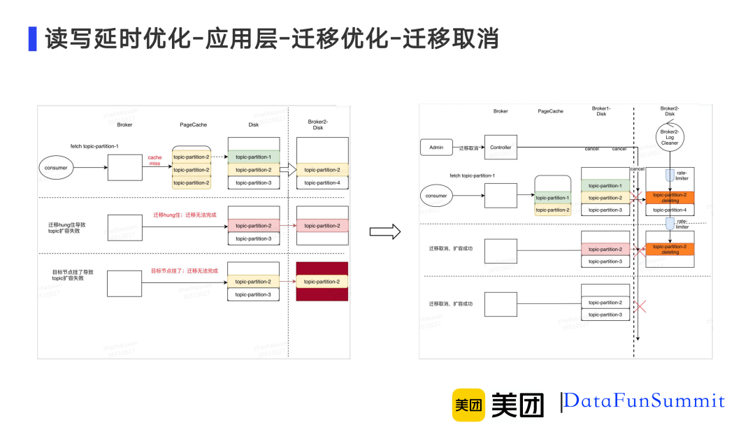 针对上面提到的各种问题,我们支持了一个功能叫迁移取消。当遇到这类问题时,管理员可以调用迁移取消命令,中断正在迁移的分区,针对第一种场景,pagecache就不会被污染,实时读得以保证;在二、三类场景中,因为迁移取消,扩容得以完成。