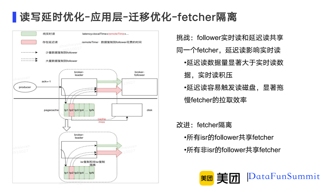 针对这种问题我们做的策略叫fetcher隔离。也就是说所有isr的follower共享fetcher,所有非isr的follower共享fetcher,这样就能保证所有isr中的实时读不会被非isr的回溯读所影响。