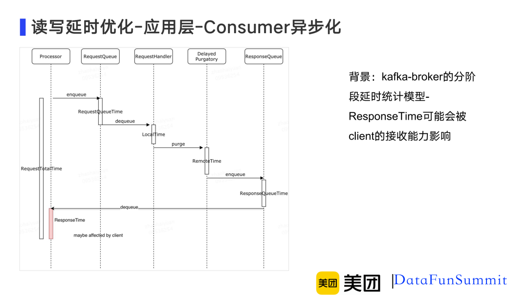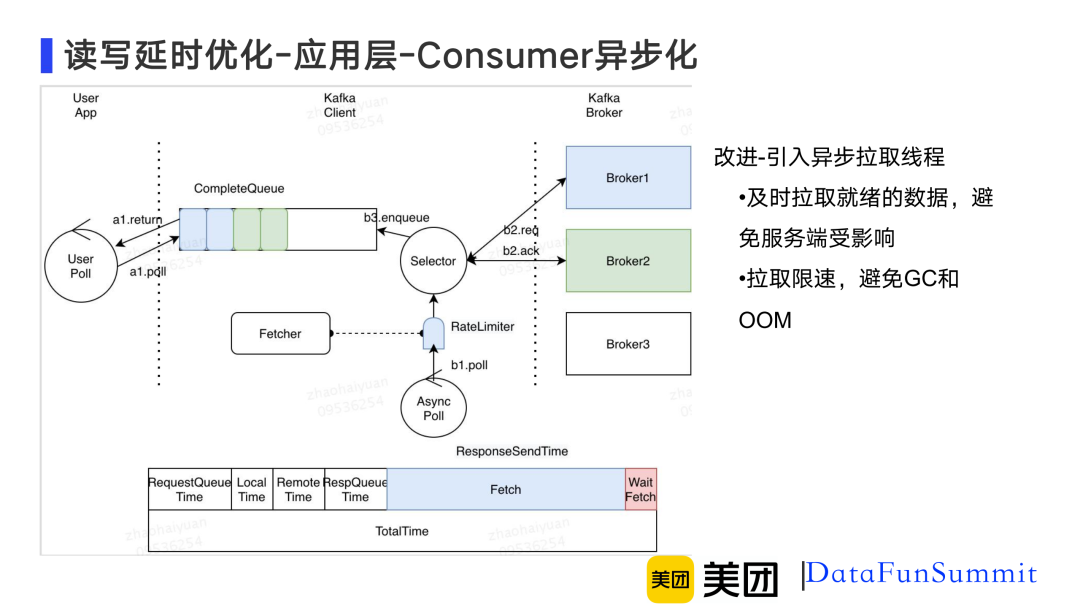 针对这个问题我们的改进是引入异步拉取线程。异步拉取线程会及时的拉取就绪的数据,避免服务端延时指标受影响,而且原生Kafka并没有限制同时拉取的分区数,我们在这里做了限速,避免GC和OOM的发生。异步线程在后台持续不断地拉取数据放到CompleteQueue中。