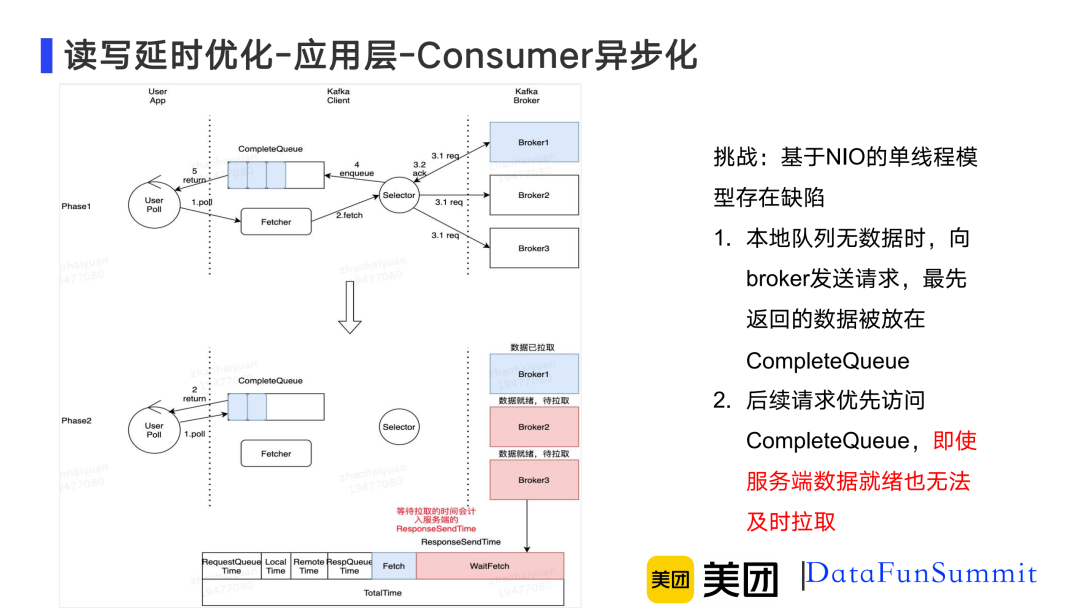 主要问题是因为Kafka原生consumer基于NIO的单线程模型存在缺陷。如图2-7所示,在phase1,user首先在调用poll请求时,当本地无数据时,同时向broker1、broker2和broker3发送请求,实际上broker1的数据先回来了,Kafka Client立即将数据写入CompleteQueue,这个时候立即返回,不会再拉取broker2和broker3的数据,此时user线程会直接从CompleteQueue中读取数据,然后直接返回。此时broker2和broker3服务端可能已经处理好,数据已经准备就绪。user线程会继续调用poll,访问下一批请求,可是因为CompleteQueue依然存在broker1上次拉取的数据,这时user线程直接返回了,这样就会导致broker2和broker3中已就绪的数据一直得不到拉取。如图中phase2,因为单线程模型存在缺陷导致waitFetch这部分时长变大,导致Kafka-broker延时指标不断升高。