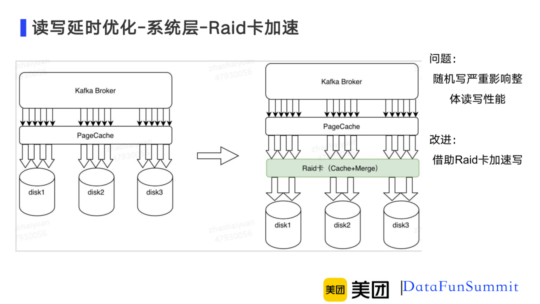 众所周知,Kafka的写入借助了Zero Copy技术将数据直接写入pagecache,但是随着随机读写并发量的提升,随机写导致的性能不足问题就会显现出来。表现是随机写入的延时会显著升高,针对这个问题我们引入了Raid卡。Raid卡有一个好处是自带缓存,而且Raid卡使用的是Raid-0模式,并没有冗余,与pagecache类似,在这一层会继续做merge,把数据merge成更大的block写入disk。更加充分利用顺序写HDD的带宽,借助Raid卡保证了随机写的性能是比较稳定的。