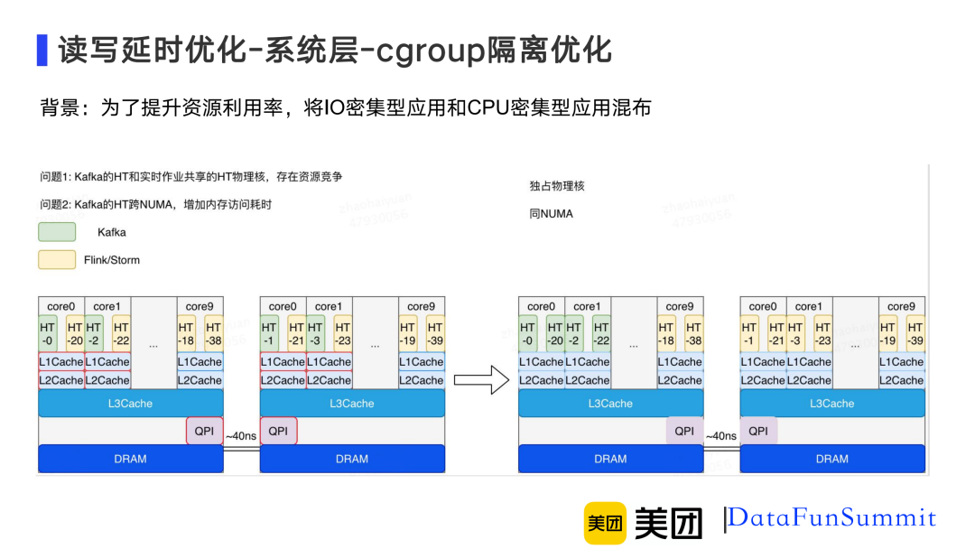 在介绍cgroup的隔离优化之前需要提到的背景是,为了提高资源利用率,美团数据平台将IO密集型应用和CPU密集型应用混布。IO密集型应用在这里指的就是Kafka,CPU密集型应用在这里指的是Flink和Storm,但是原有的隔离策略存在两个问题:首先是物理核本身会存在资源竞争,在这个物理核下,共享的L1cache和L2cache都存在竞争,当实时平台CPU飙升时会导致Kafka读写延时受到影响;另外,Kafka的HT跨NUMA,增加内存访问耗时,如图2-10所示,跨NUMA节点是通过QPI去做远程访问,而这个远程访问的耗时是40ns。