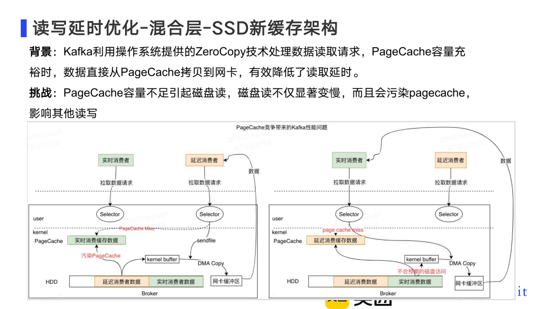 如图2-11中左半部分所示,当一个延迟消费者去拉取数据时,发现pagecache中没有它想要的数据,这个时候就会触发磁盘读,磁盘读后会将数据回写到pagecache,导致pagecache污染,自己读写延迟变慢同时也会导致另一个实时消费受影响,因为对于实时消费而言,它一直读的是最新的数据,最新的数据按正常来说时不应该出发磁盘读的。