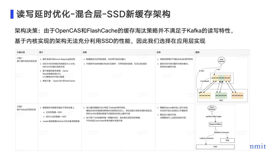 方案二,是基于Kafka的应用层去实现,具体就是Kafka的数据按照时间维度存储在不同设备上,对于近实时数据直接放在SSD上,针对较为久远的数据直接放在HDD上,然后leader直接根据offset从对应设备读取数据。这种方案的优势是他的缓存策略充分考虑了Kafka的读写特性,确保近实时的数据消费请求全部落在SSD上,保证这部分请求处理的低延迟,同时从HDD读取的数据不回刷到SSD防止缓存污染,同时由于每个日志段都有唯一明确的状态,因此每次请求目的明确,不存在因cache miss带来的额外性能开销。同时劣势也很明显,需要在server端代码上进行改进,涉及的开发以及测试工作量较多。