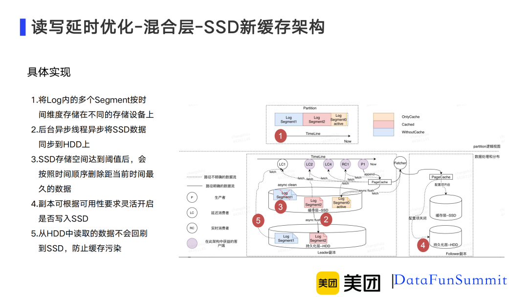 首先新的缓存架构会将log内的多个segment按时间维度存储在不同的存储设备上,如图2-14中的红圈1,新缓存架构数据会有三种典型状态,一种叫only cache,指的是数据刚写进SSD,还未同步到HDD上;第2个是cached,指数据既同步到了HDD也有一部分缓存在SSD上;第三种类型叫withoutCache,指的是同步到了HDD但是SSD中已经没有缓存了;