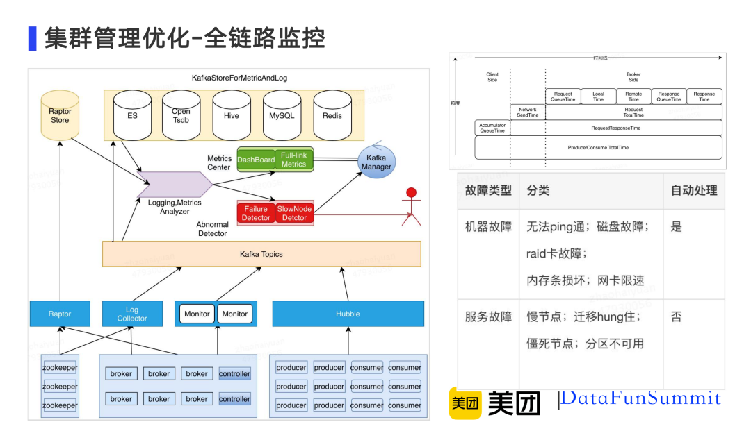 针对这两个问题,我们做了全链路监控这样一个项目。把Kafka核心组件以及指标全部收集起来做了一个全链路的追踪,通过分析上报上来的日志和指标,我们就可以建立细粒度的日志大盘。当某一个读写请求变慢时,我们通过日志大盘很容易就知道他具体是慢在哪个环节。日志和指标的解析服务可以自动实时感知故障还有一些慢节点,这两类故障有一部分我们可以做到自动处理,我们会把他通过事件的方式通知到Kafka manager,然后Kafka manager会根据这个事件自动去处理这些故障。还有一类故障是无法得到自动处理的,比如说僵尸节点,僵尸节点指的是zookeeper的临时节点还没有掉线,但是这个节点不管是controller也好还是客户端也好,都已经无法访问了,访问就会报错或者超时,这一类故障需要人工介入处理,会直接发给具体的管理员。