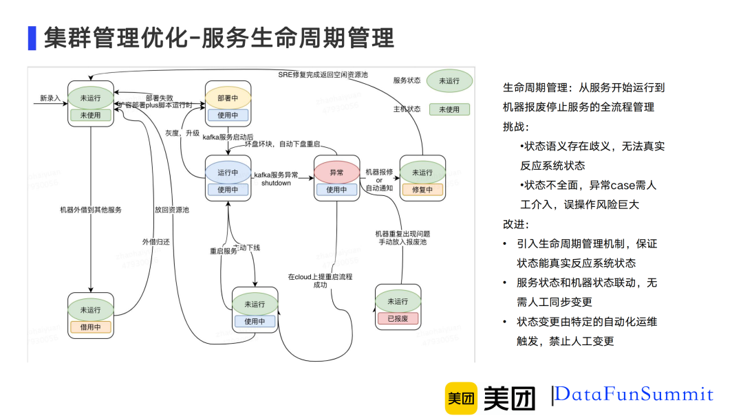基于这两点问题,我们引入了生命周期管理机制,保证状态能真实反映系统状态。生命周期管理指的是从服务开始运行到机器报废停止服务的全流程管理。并且做到了服务状态和机器状态联动,无需人工同步变更。而且新的生命周期管理机制的状态变更由特定的自动化运维触发,禁止人工变更。