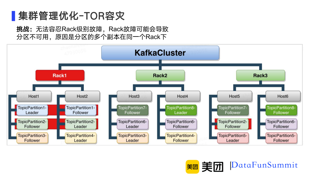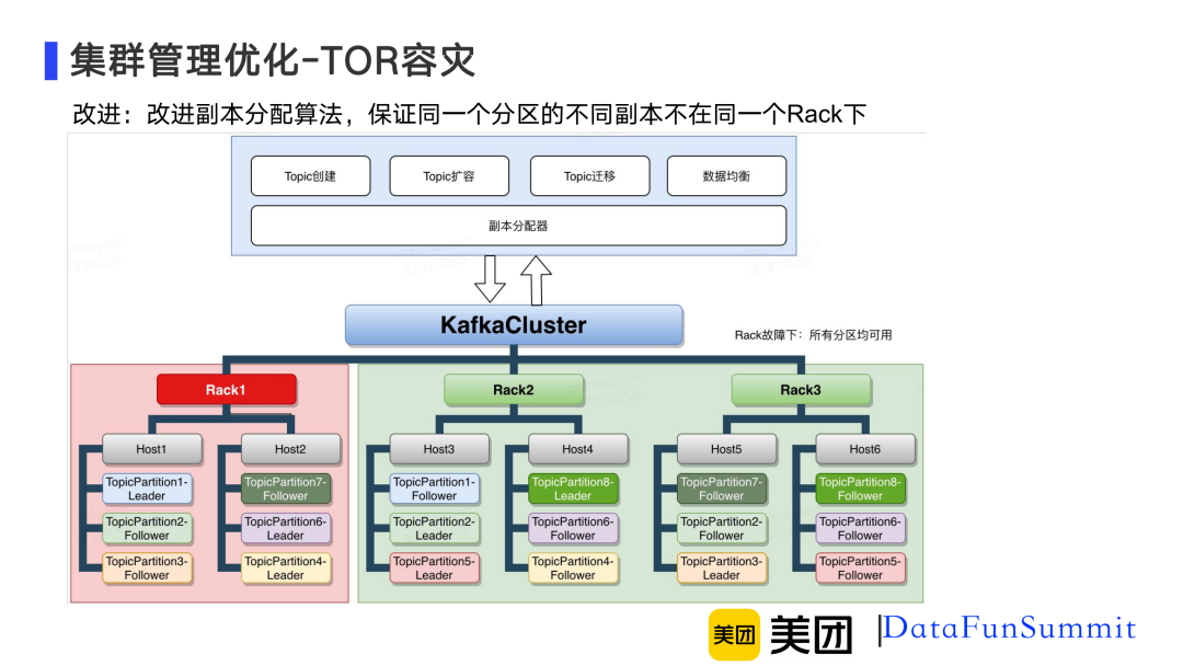 针对Rack级别的故障,我们做了TOR容灾。改进了副本的分配算法,保证同一个分区的不同副本不在同一个rack下,如图3-5所示,即使rack1整个发生故障,也能保证所有分区是可用的。