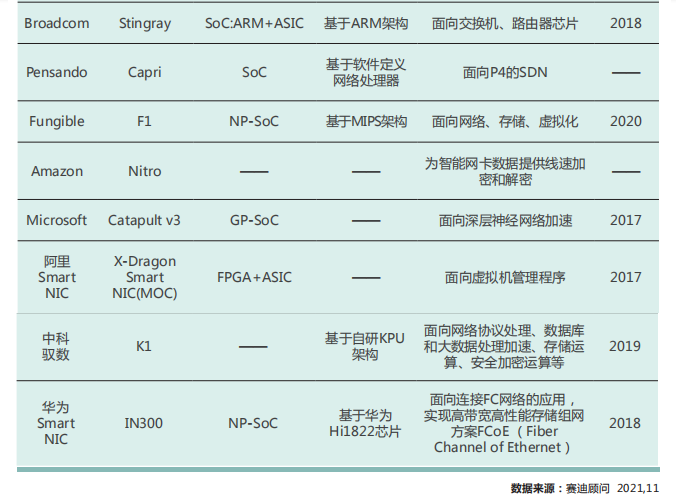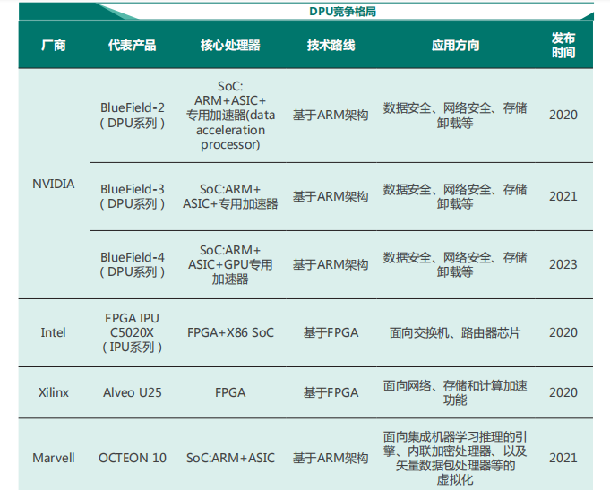 随着DPU将数据中心的基础设施操作从CPU上卸载过来,数据中心将形成DPU、GPU、CPU三位一体的状态;NVIDIA通过收购Mellanox积极布局DPU,抢占市场,凭借在GPU的绝对优势以及未来DPU的发力,NVIDIA有望在服务器处理器三大芯片中占据其二。对各厂商及现有产品分别综述如下: