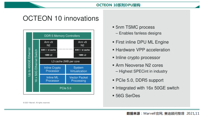 Marvell最新推出的OCTEON 10系列DPU采用了台积电5nm制程工艺,且首次用上了ARM的Neoverse N2 CPU内核。这种类型的多功能芯片,旨在帮助移动和处理那些通过网络传输的数据,可实现集成机器学习推理的引擎、Inline加密处理引擎、以及矢量数据包处理器等的虚拟化。OCTEON 10也是Marvell首款采用台积电N5P工艺制造的DPU芯片。其不仅率先集成了ARM的Neoverse N2 CPU核心,还支持最新的PCIe 5.0 I/O与DDR5内存。