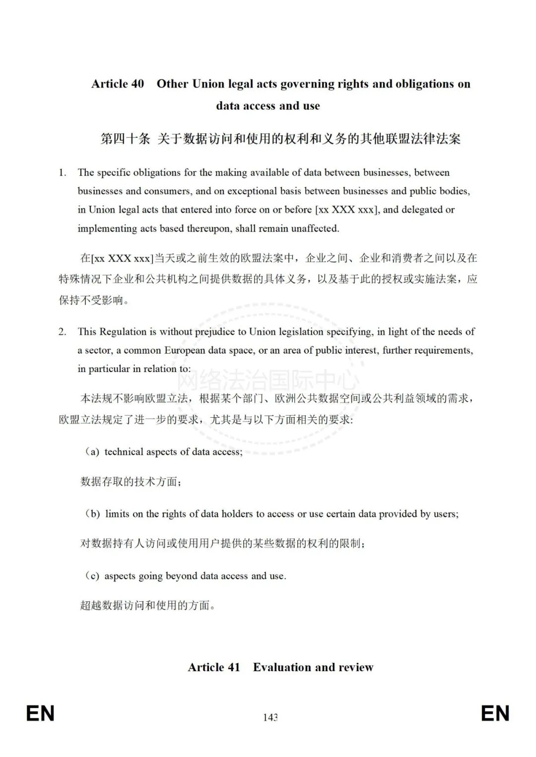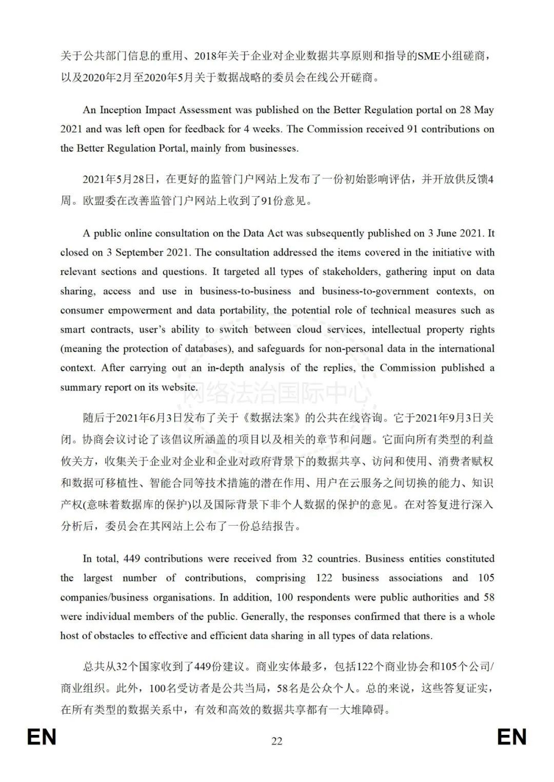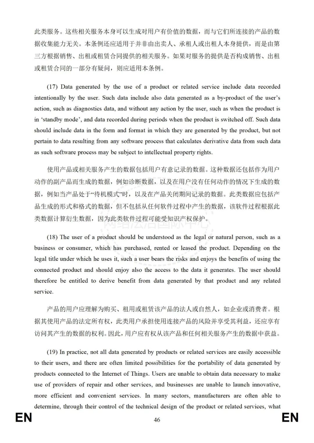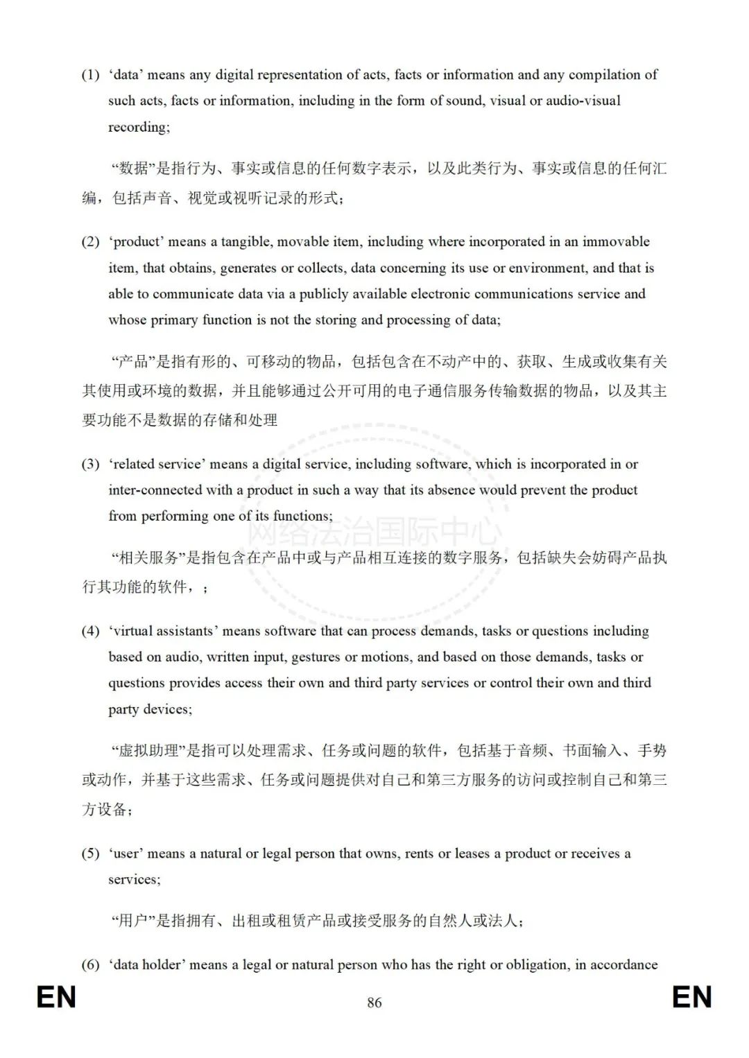 2022年2月23日,欧盟委员会如期公布新一代数据治理立法《数据法案》(Data Act)草案全文。该草案条文涉及数据共享、公共机构访问、国际数据传输、云转换和互操作性等诸多方面等规定,监管对象主要为互联网产品的制造商、数字服务提供商和用户等,具有重要的风控合规风向标意义。网络法治国际中心团队完成该法案中文译本并收录于LexiNexi数据库。—— 吴沈括,网络法治国际中心执行主任、博导、中国互联网协会研究中心副主任。