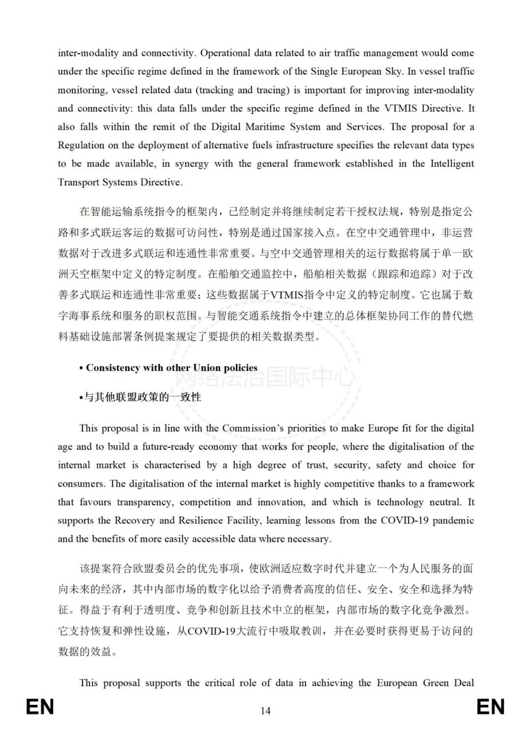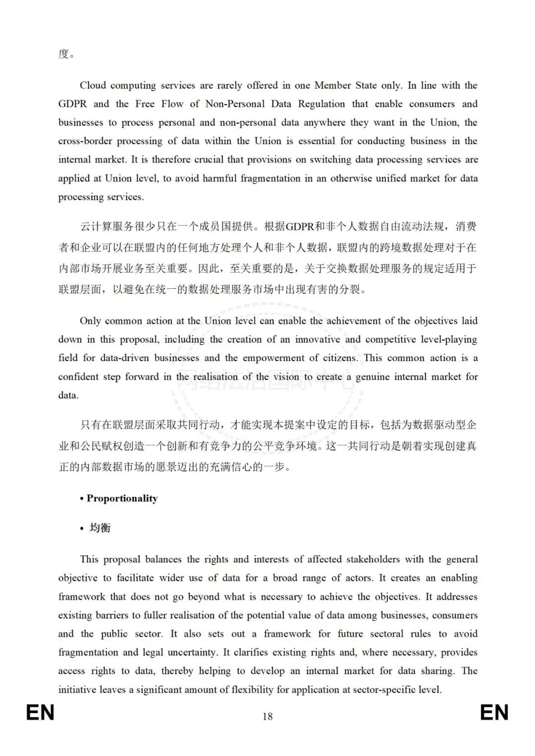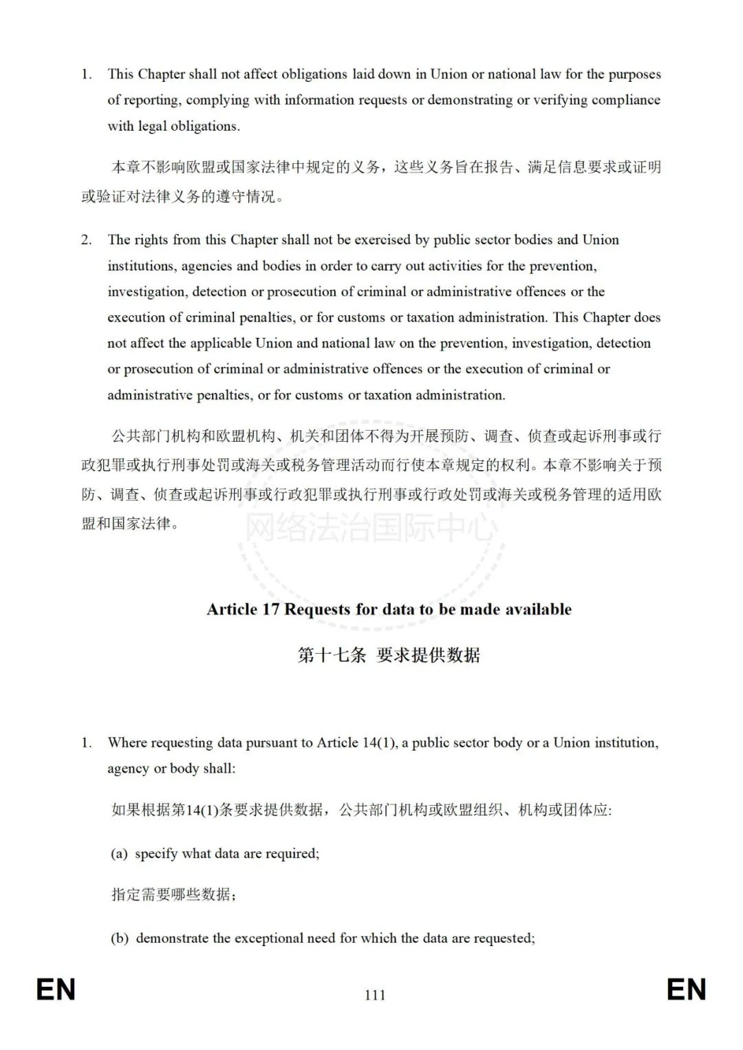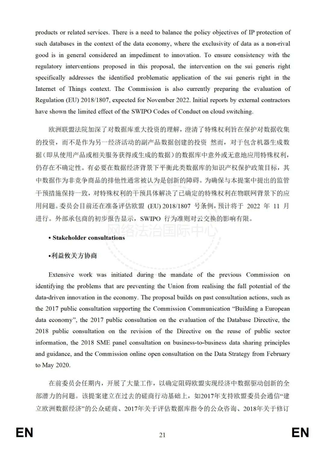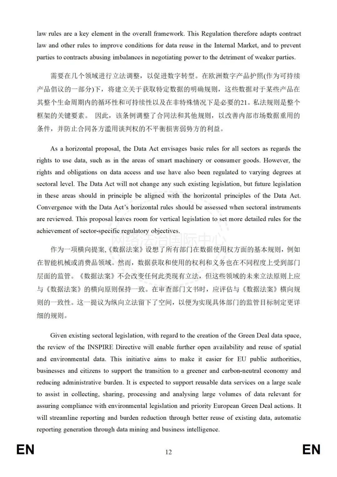 2022年2月23日,欧盟委员会如期公布新一代数据治理立法《数据法案》(Data Act)草案全文。该草案条文涉及数据共享、公共机构访问、国际数据传输、云转换和互操作性等诸多方面等规定,监管对象主要为互联网产品的制造商、数字服务提供商和用户等,具有重要的风控合规风向标意义。网络法治国际中心团队完成该法案中文译本并收录于LexiNexi数据库。—— 吴沈括,网络法治国际中心执行主任、博导、中国互联网协会研究中心副主任。