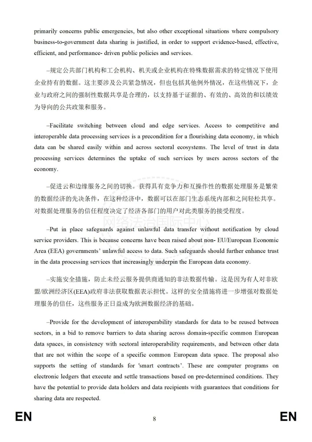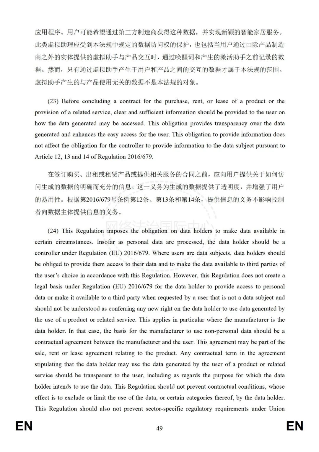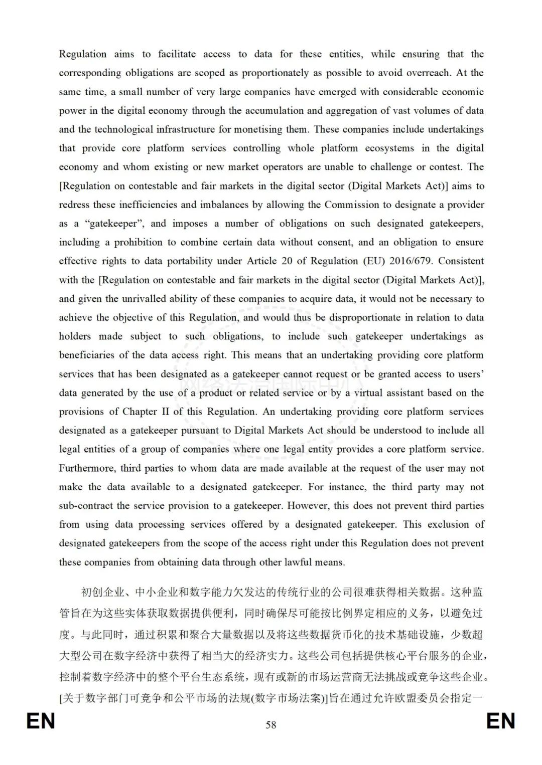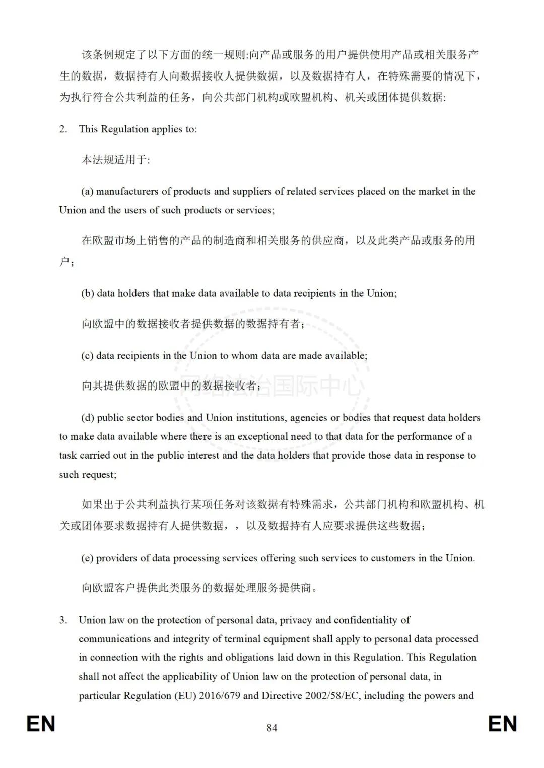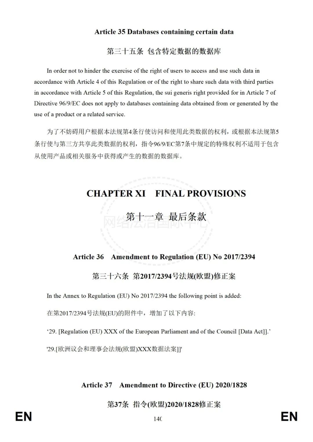 2022年2月23日,欧盟委员会如期公布新一代数据治理立法《数据法案》(Data Act)草案全文。该草案条文涉及数据共享、公共机构访问、国际数据传输、云转换和互操作性等诸多方面等规定,监管对象主要为互联网产品的制造商、数字服务提供商和用户等,具有重要的风控合规风向标意义。网络法治国际中心团队完成该法案中文译本并收录于LexiNexi数据库。—— 吴沈括,网络法治国际中心执行主任、博导、中国互联网协会研究中心副主任。