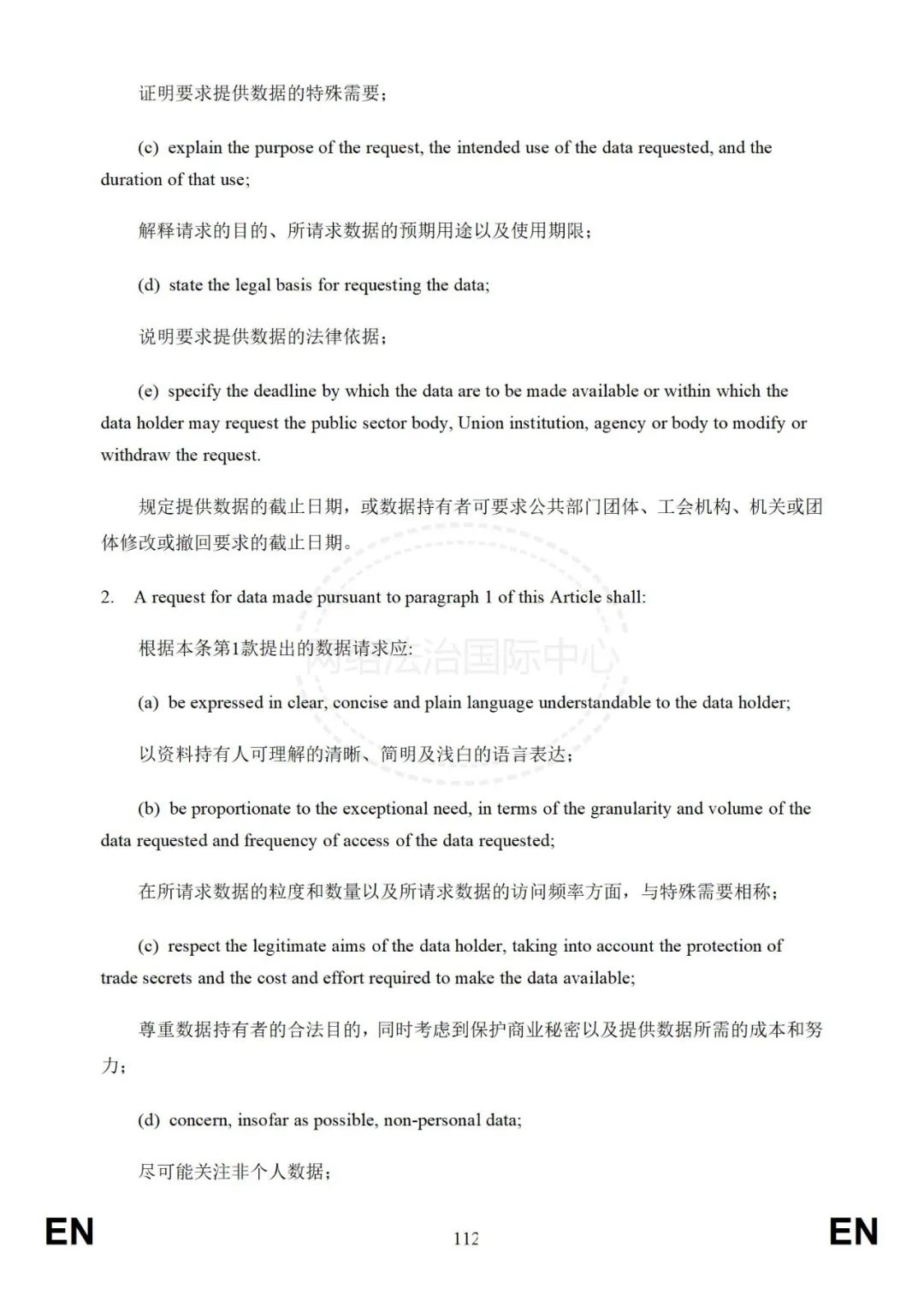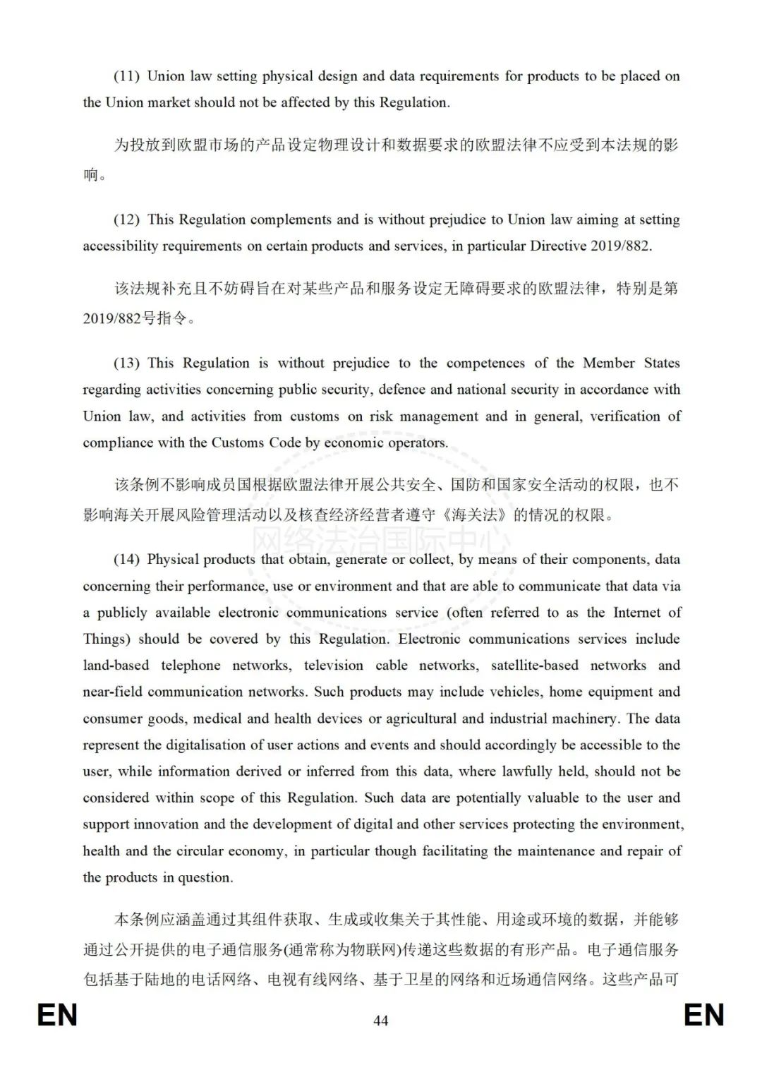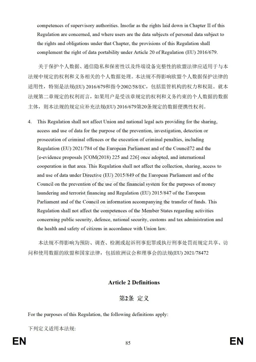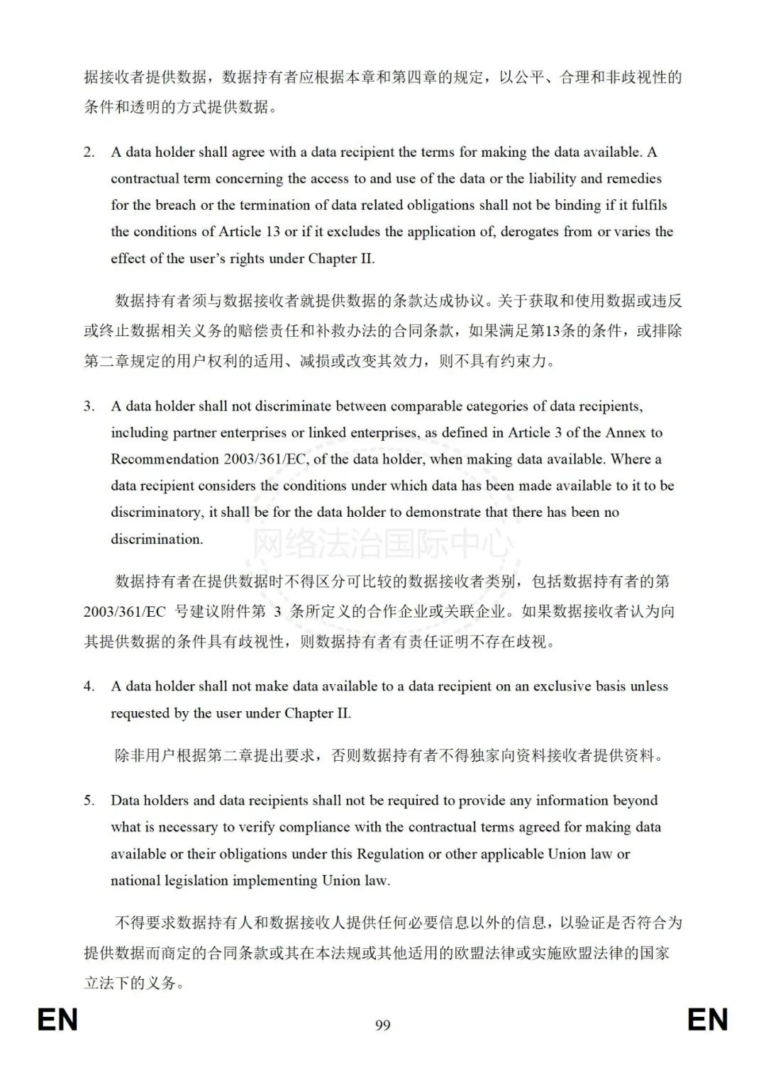 2022年2月23日,欧盟委员会如期公布新一代数据治理立法《数据法案》(Data Act)草案全文。该草案条文涉及数据共享、公共机构访问、国际数据传输、云转换和互操作性等诸多方面等规定,监管对象主要为互联网产品的制造商、数字服务提供商和用户等,具有重要的风控合规风向标意义。网络法治国际中心团队完成该法案中文译本并收录于LexiNexi数据库。—— 吴沈括,网络法治国际中心执行主任、博导、中国互联网协会研究中心副主任。