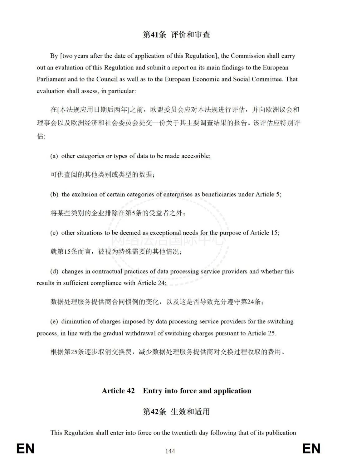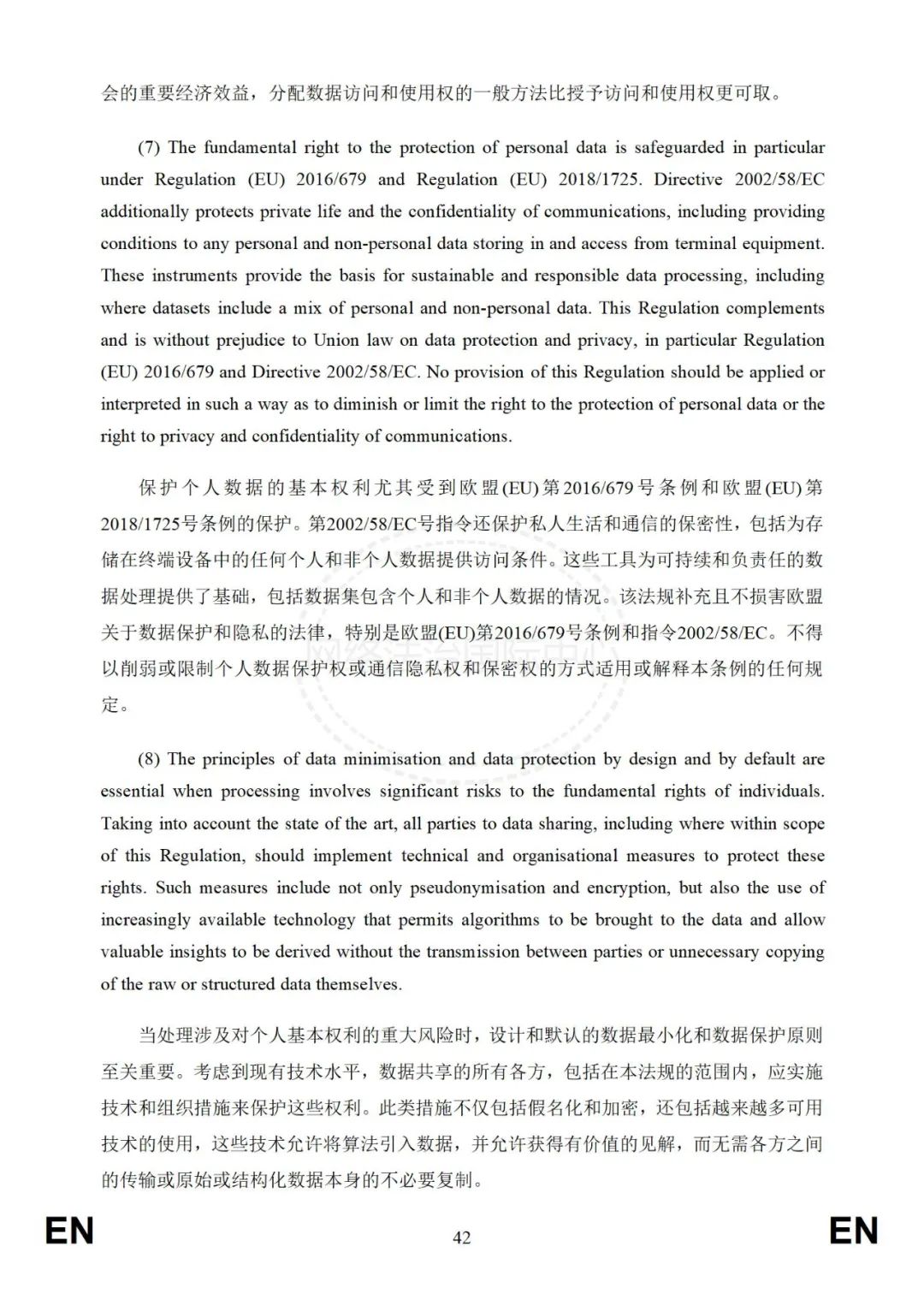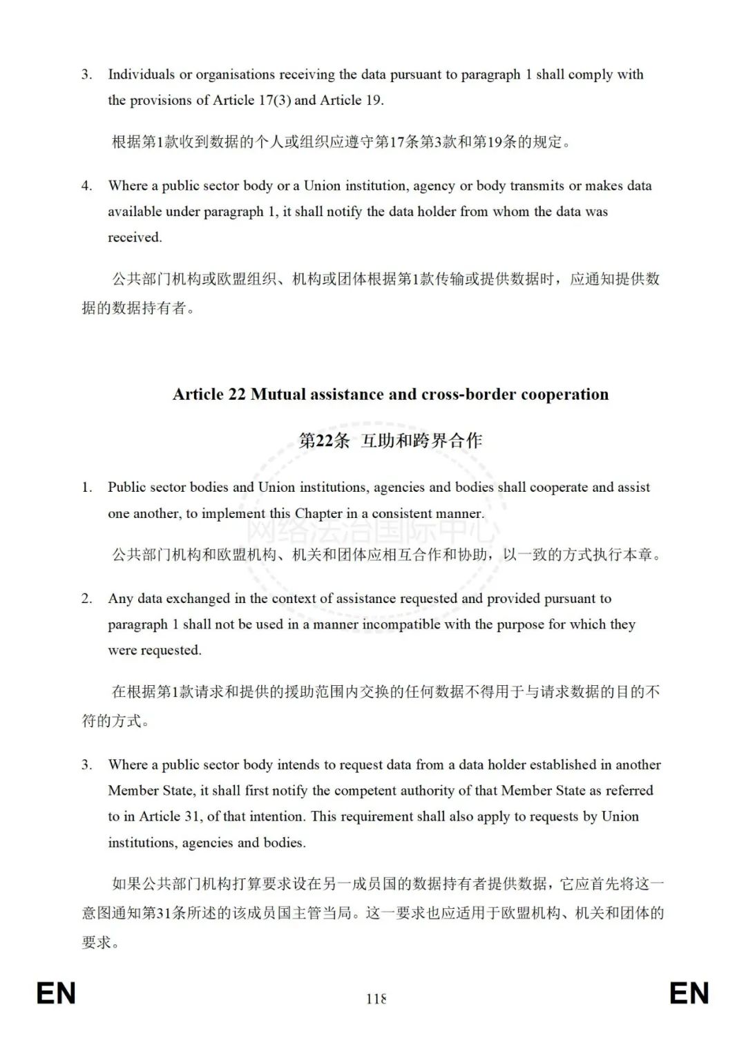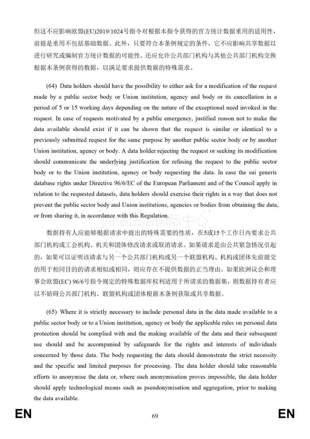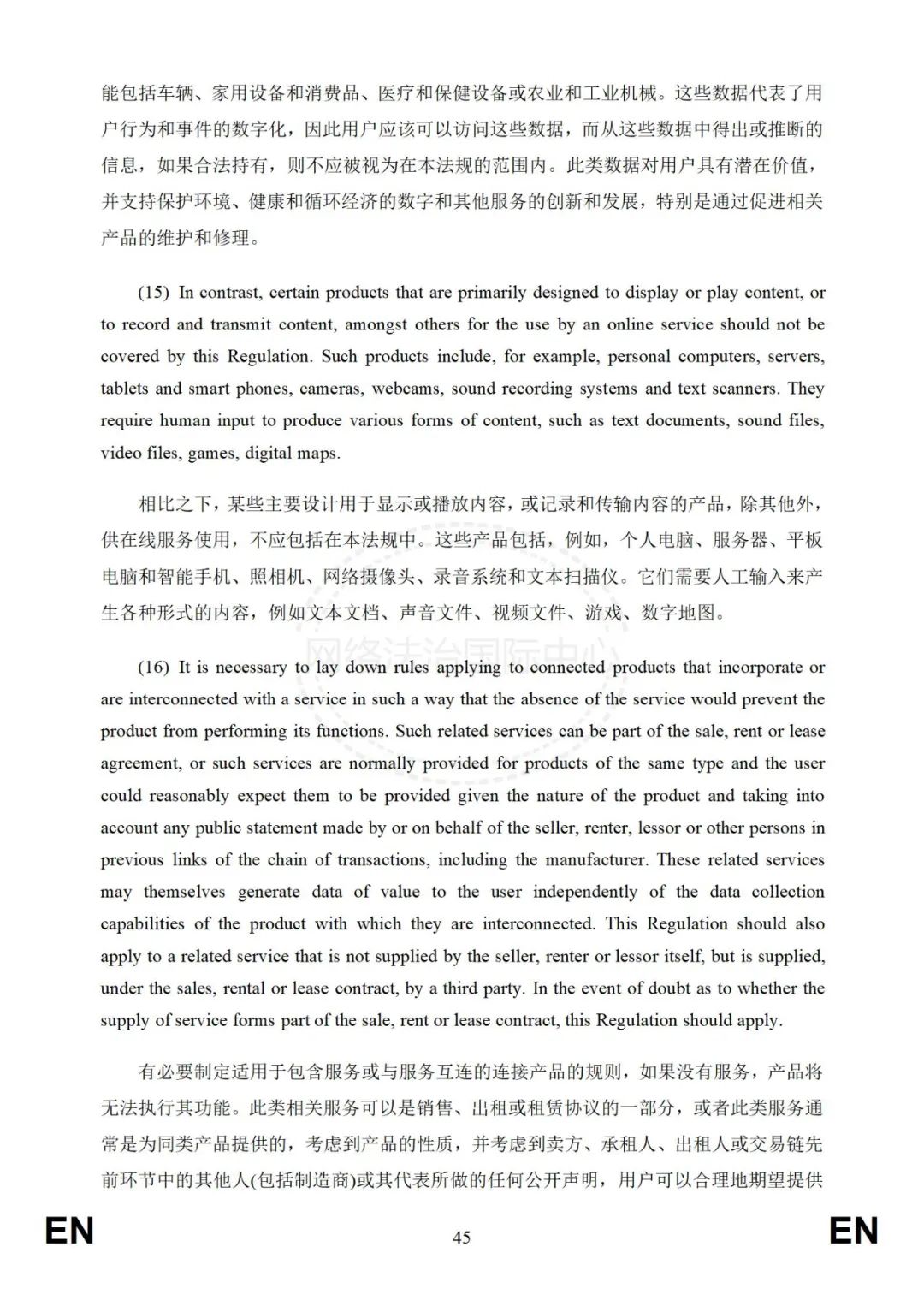 2022年2月23日,欧盟委员会如期公布新一代数据治理立法《数据法案》(Data Act)草案全文。该草案条文涉及数据共享、公共机构访问、国际数据传输、云转换和互操作性等诸多方面等规定,监管对象主要为互联网产品的制造商、数字服务提供商和用户等,具有重要的风控合规风向标意义。网络法治国际中心团队完成该法案中文译本并收录于LexiNexi数据库。—— 吴沈括,网络法治国际中心执行主任、博导、中国互联网协会研究中心副主任。