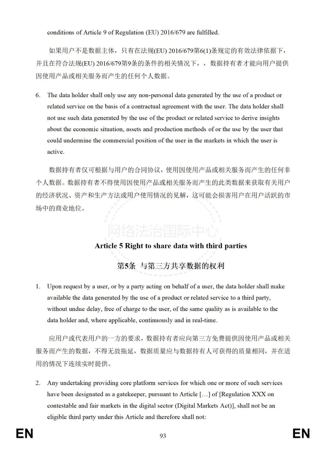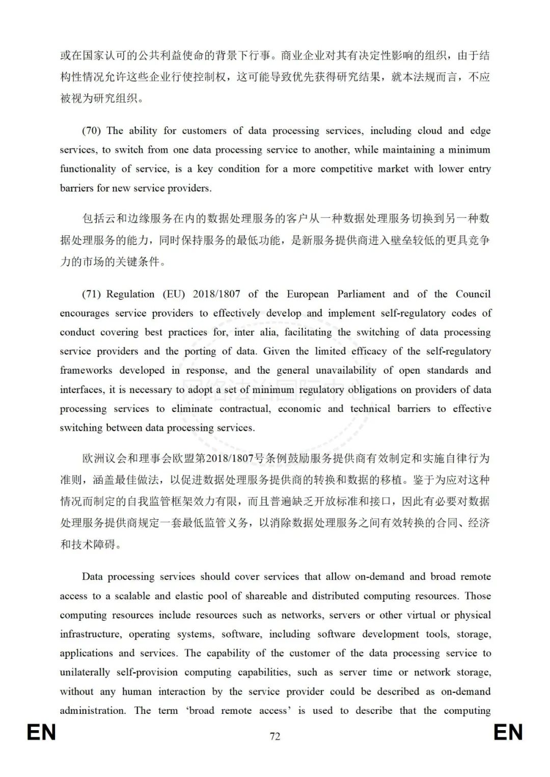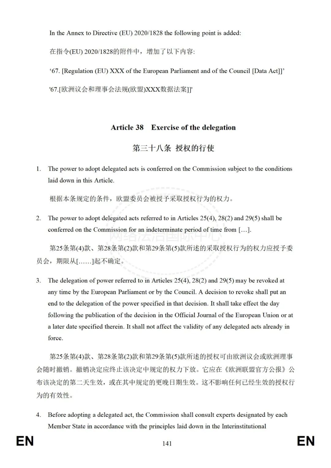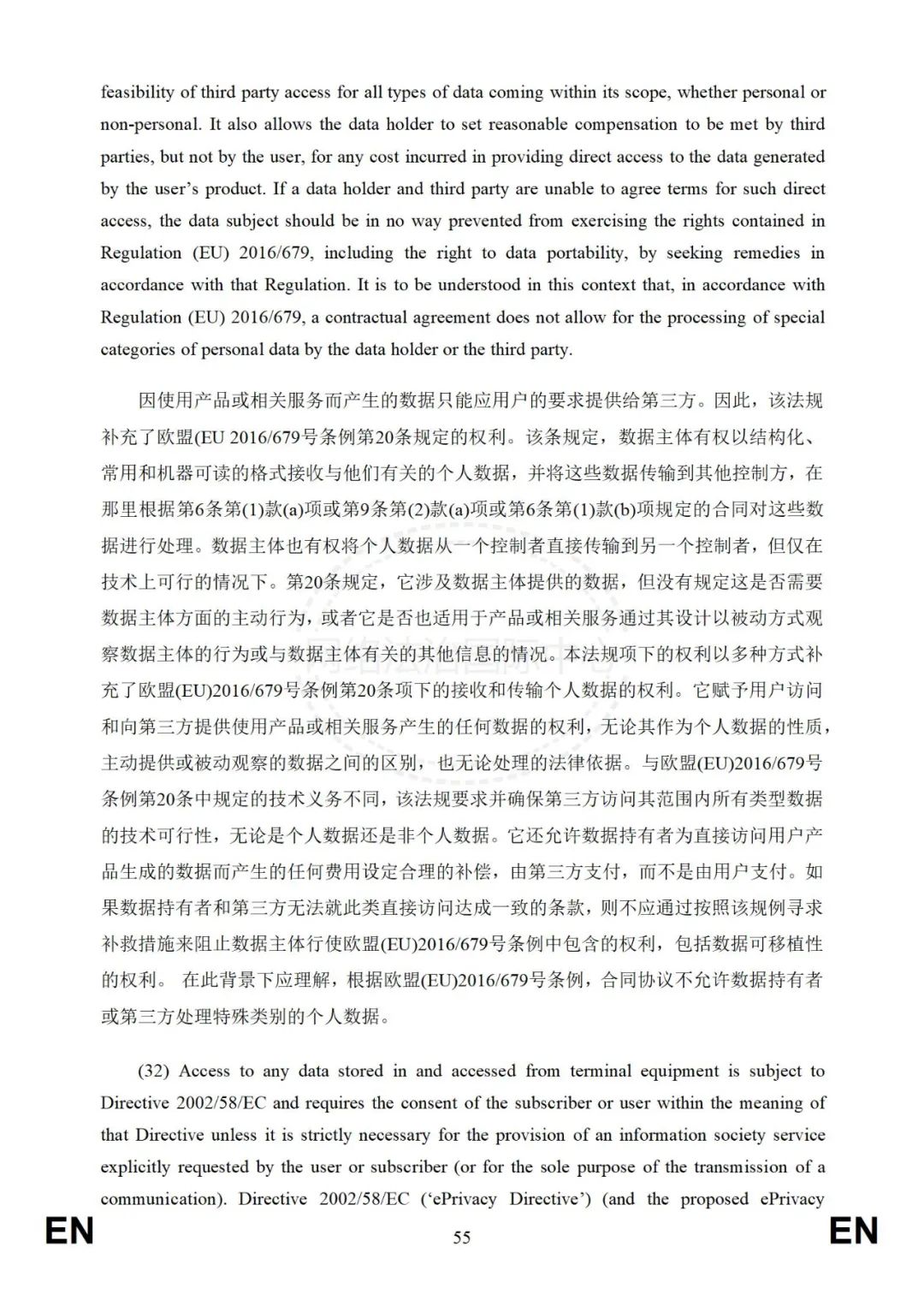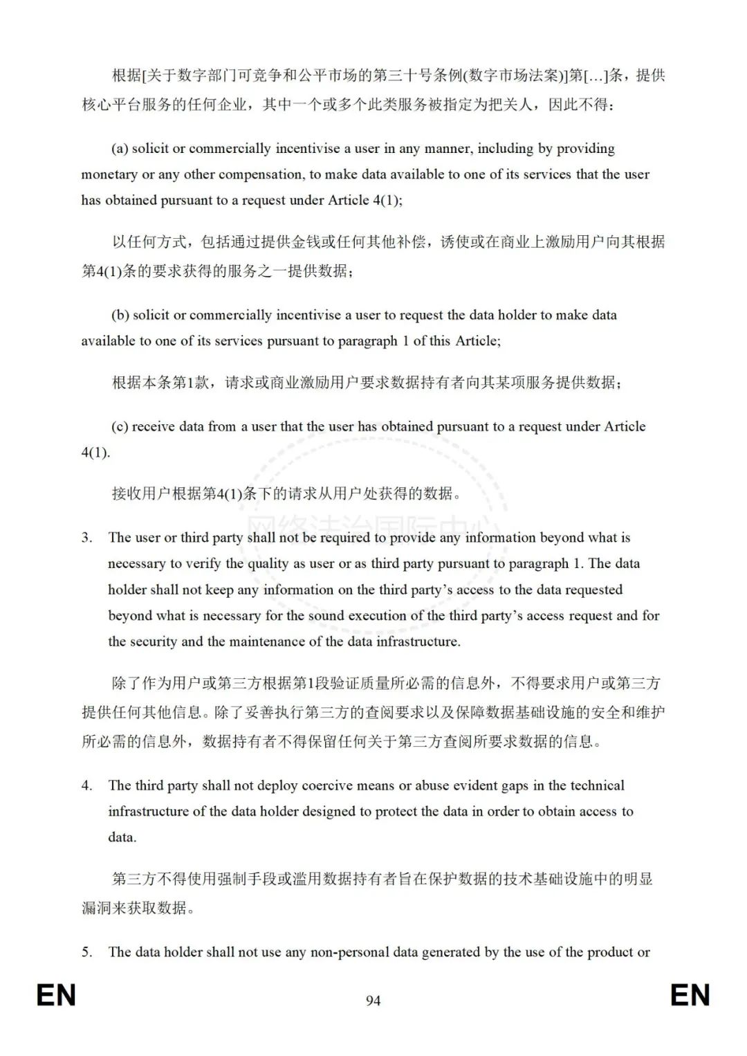2022年2月23日,欧盟委员会如期公布新一代数据治理立法《数据法案》(Data Act)草案全文。该草案条文涉及数据共享、公共机构访问、国际数据传输、云转换和互操作性等诸多方面等规定,监管对象主要为互联网产品的制造商、数字服务提供商和用户等,具有重要的风控合规风向标意义。网络法治国际中心团队完成该法案中文译本并收录于LexiNexi数据库。—— 吴沈括,网络法治国际中心执行主任、博导、中国互联网协会研究中心副主任。