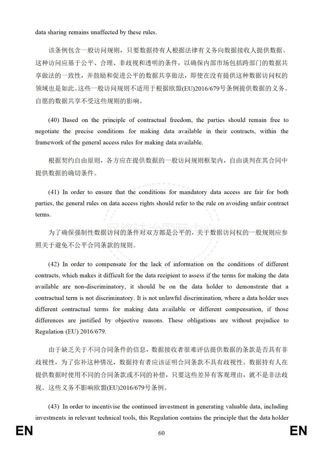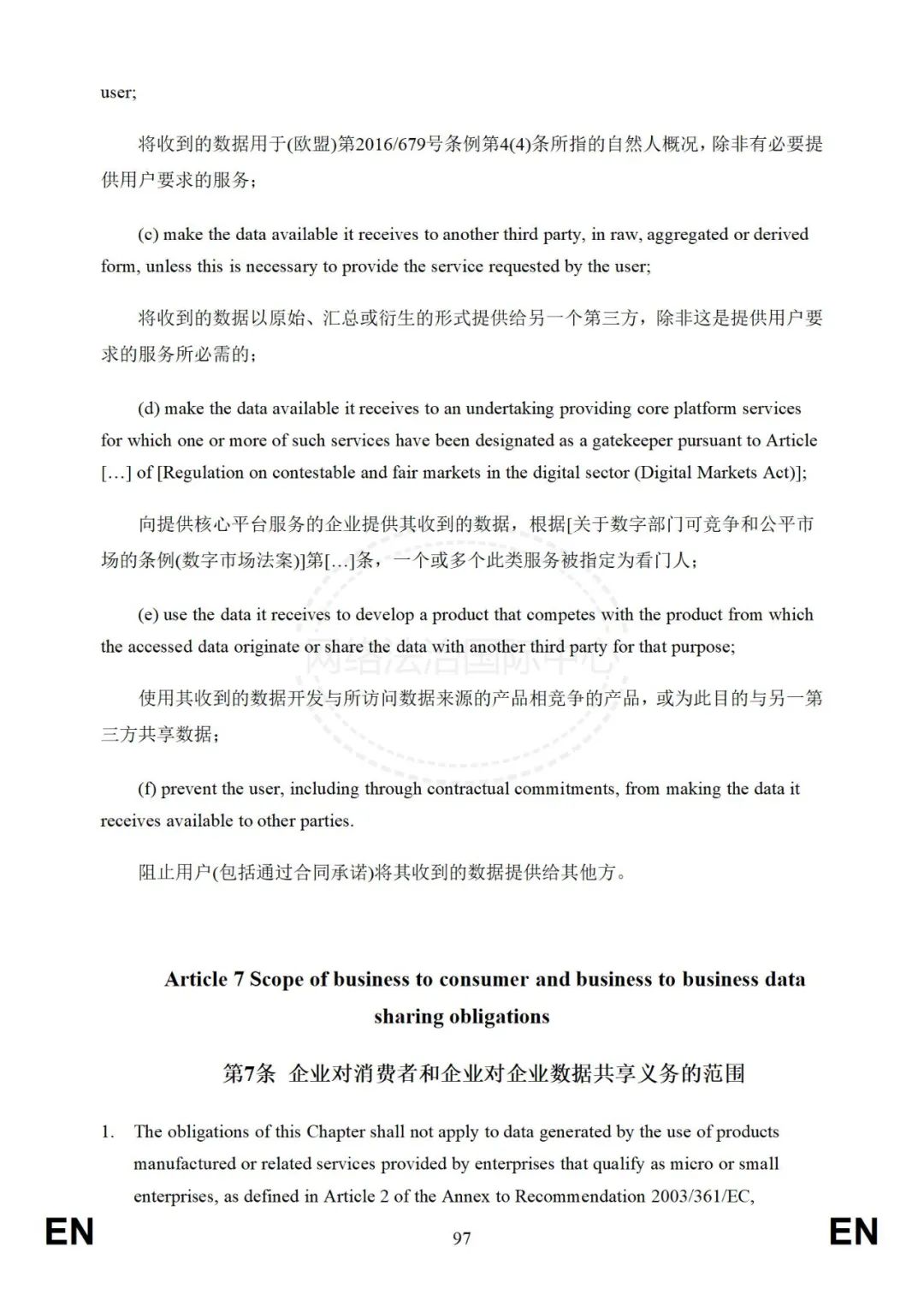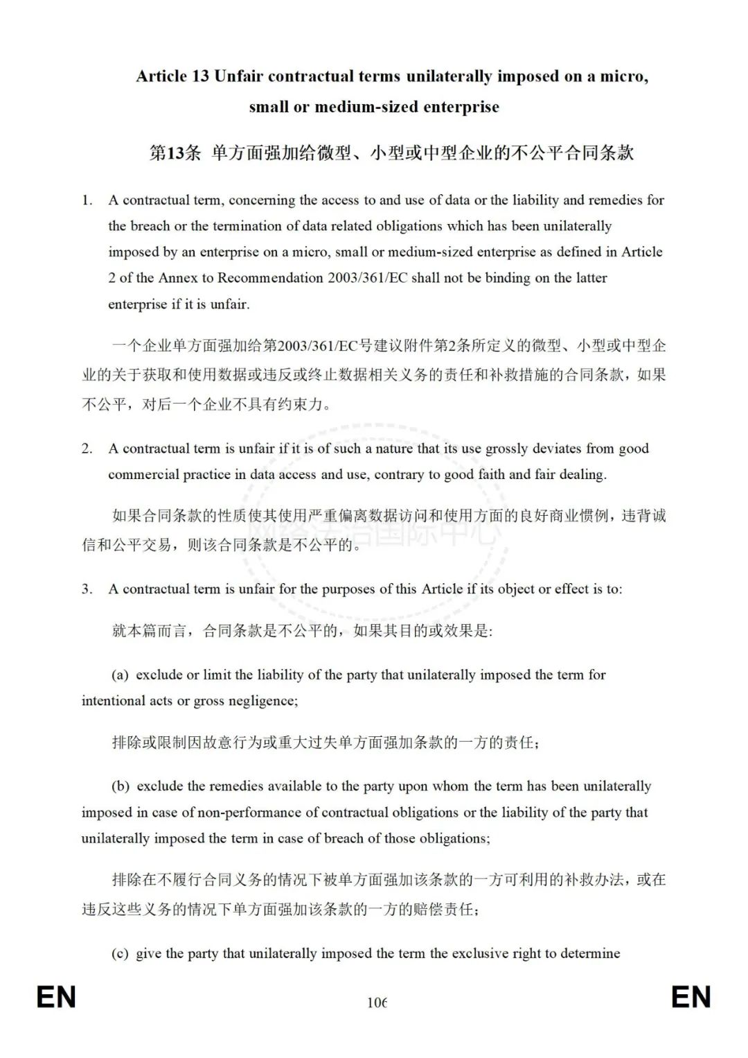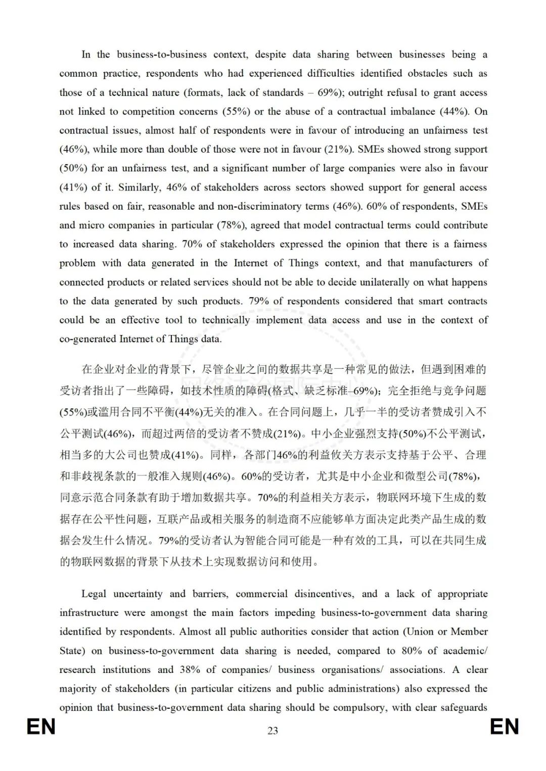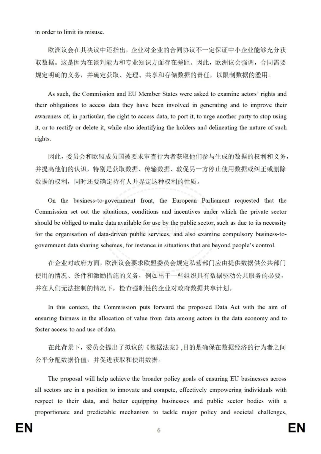 欧洲议会在其决议中还指出,企业对企业的合同协议不一定保证中小企业能够充分获取数据。这是因为在谈判能力和专业知识方面存在差距。因此,欧洲议会强调,合同需要规定明确的义务,并确定获取、处理、共享和存储数据的责任,以限制数据的滥用。(《法案》以下译文参阅下图)