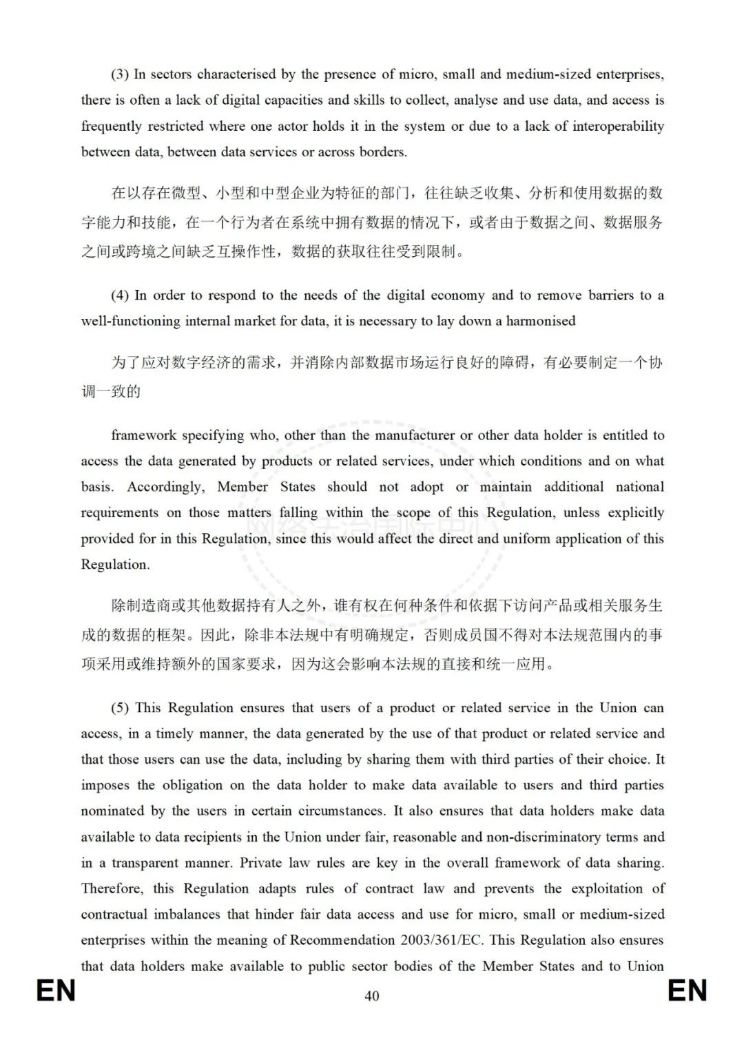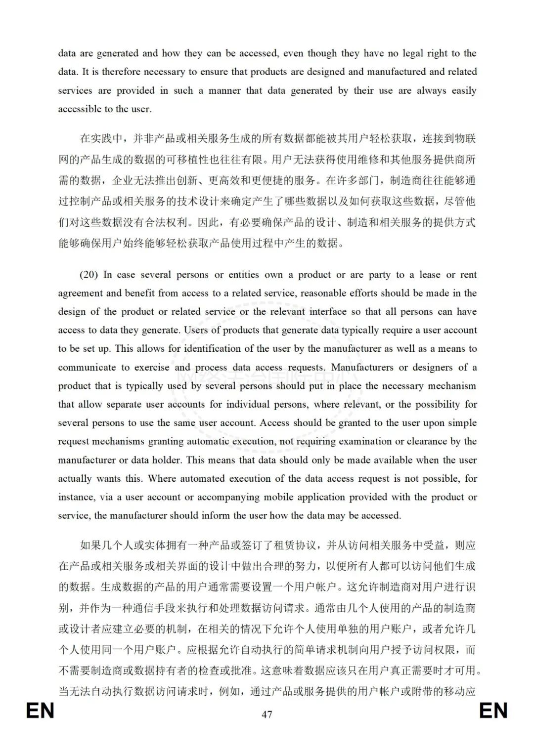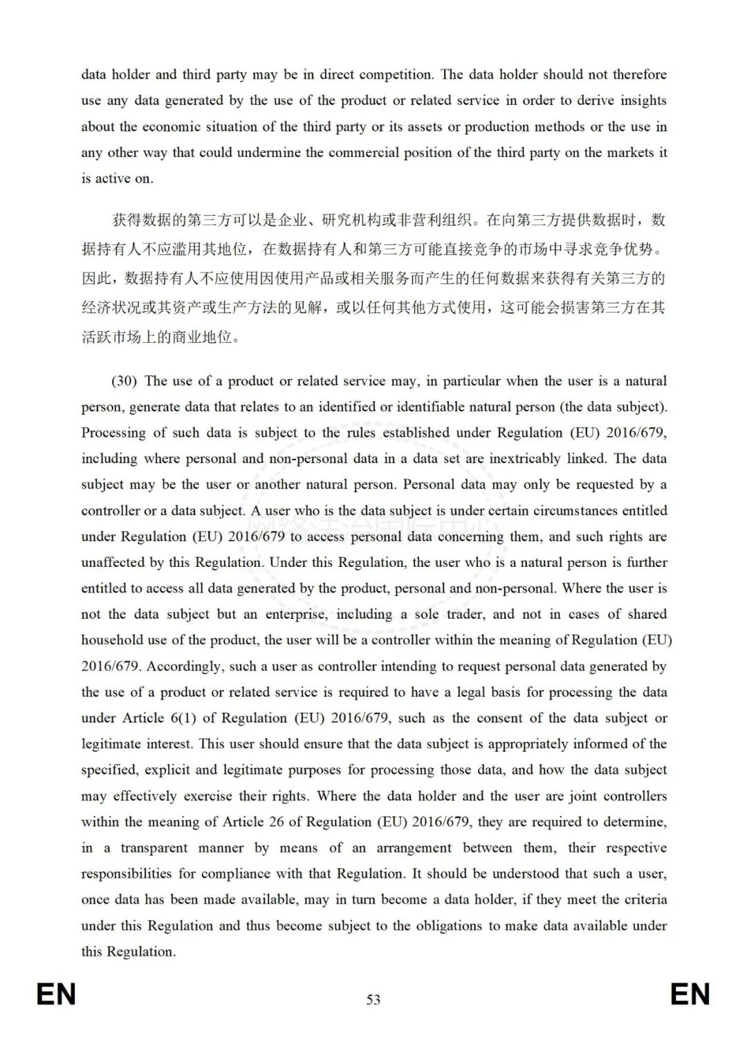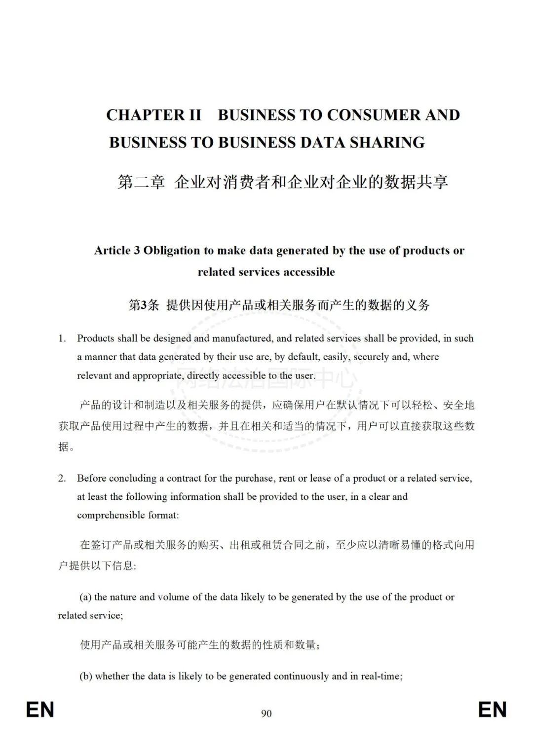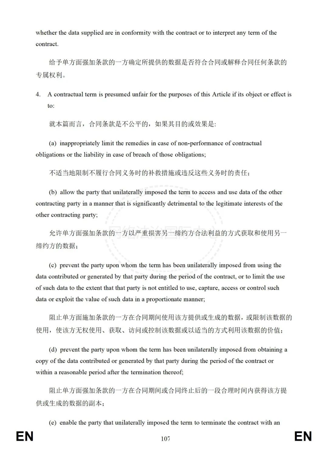 欧洲议会在其决议中还指出,企业对企业的合同协议不一定保证中小企业能够充分获取数据。这是因为在谈判能力和专业知识方面存在差距。因此,欧洲议会强调,合同需要规定明确的义务,并确定获取、处理、共享和存储数据的责任,以限制数据的滥用。(《法案》以下译文参阅下图)