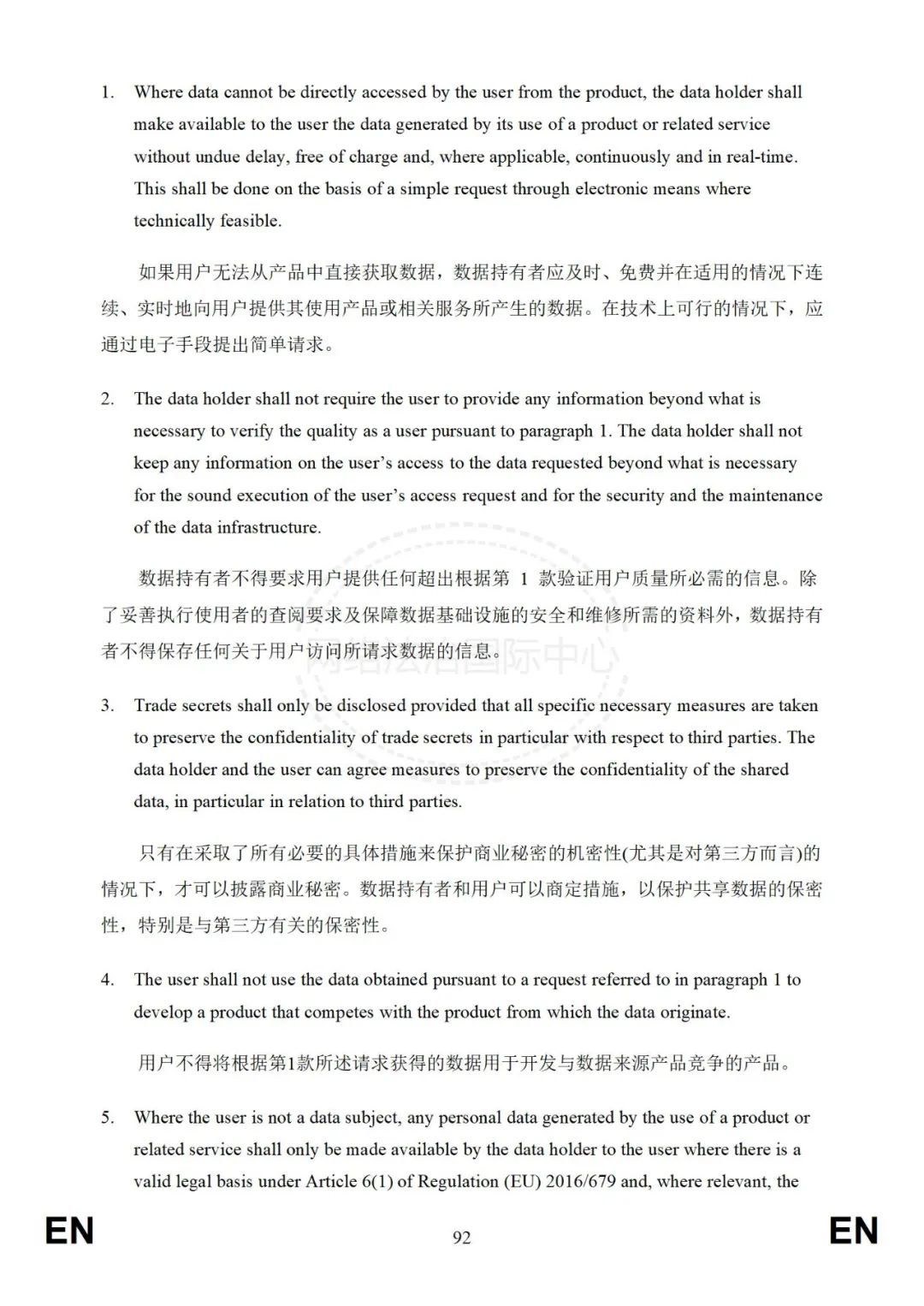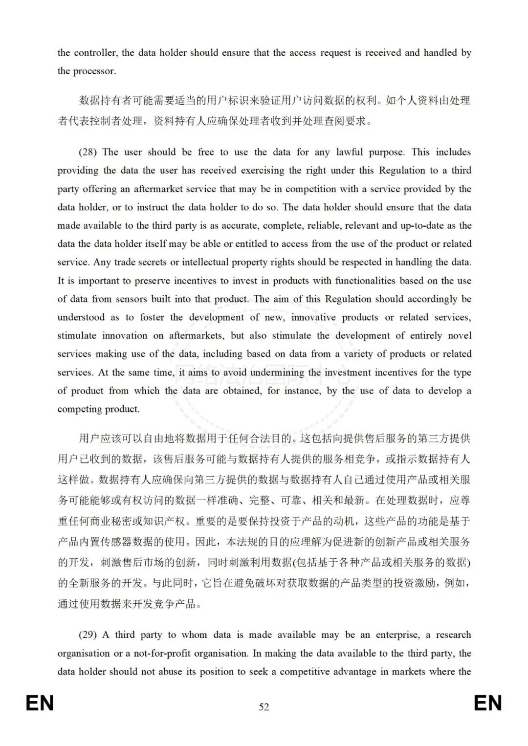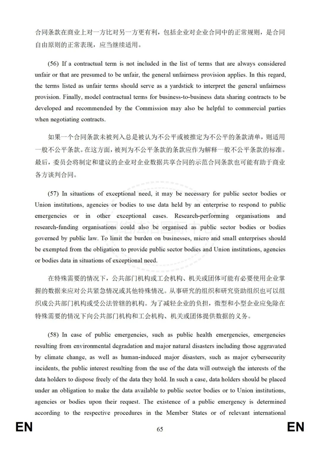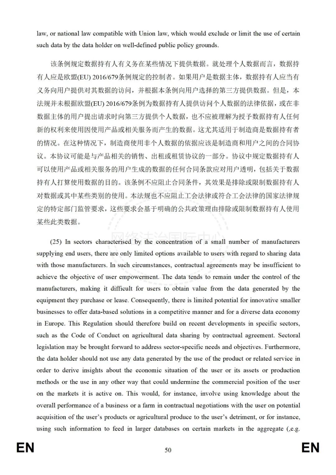 欧洲议会在其决议中还指出,企业对企业的合同协议不一定保证中小企业能够充分获取数据。这是因为在谈判能力和专业知识方面存在差距。因此,欧洲议会强调,合同需要规定明确的义务,并确定获取、处理、共享和存储数据的责任,以限制数据的滥用。(《法案》以下译文参阅下图)