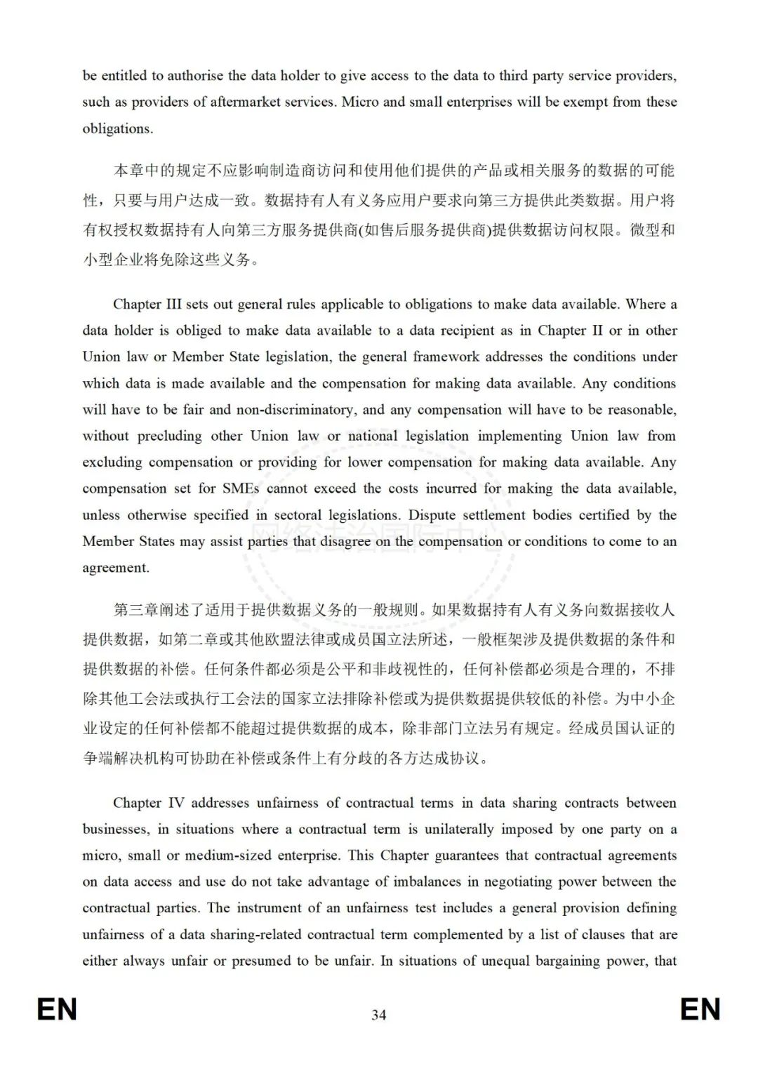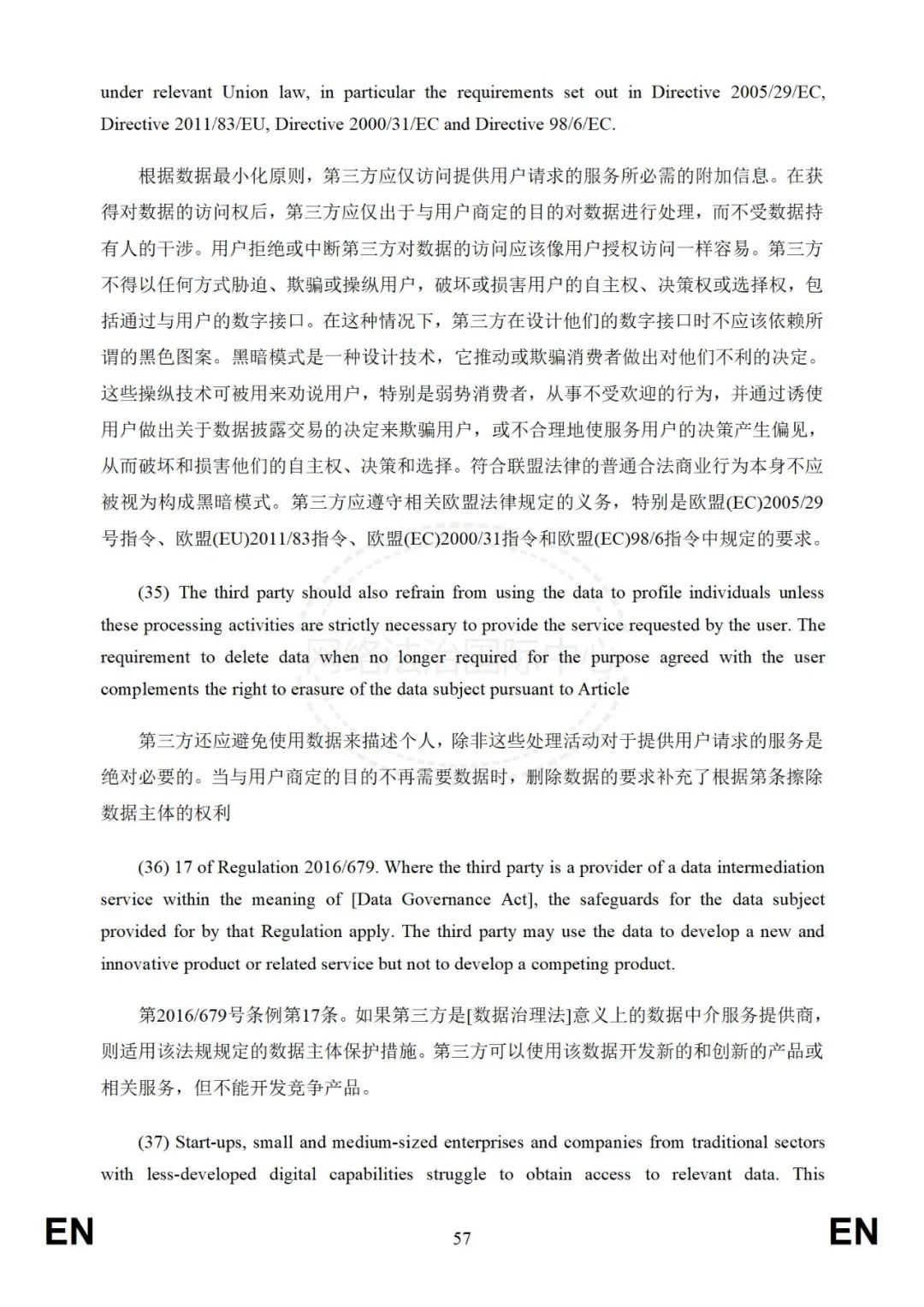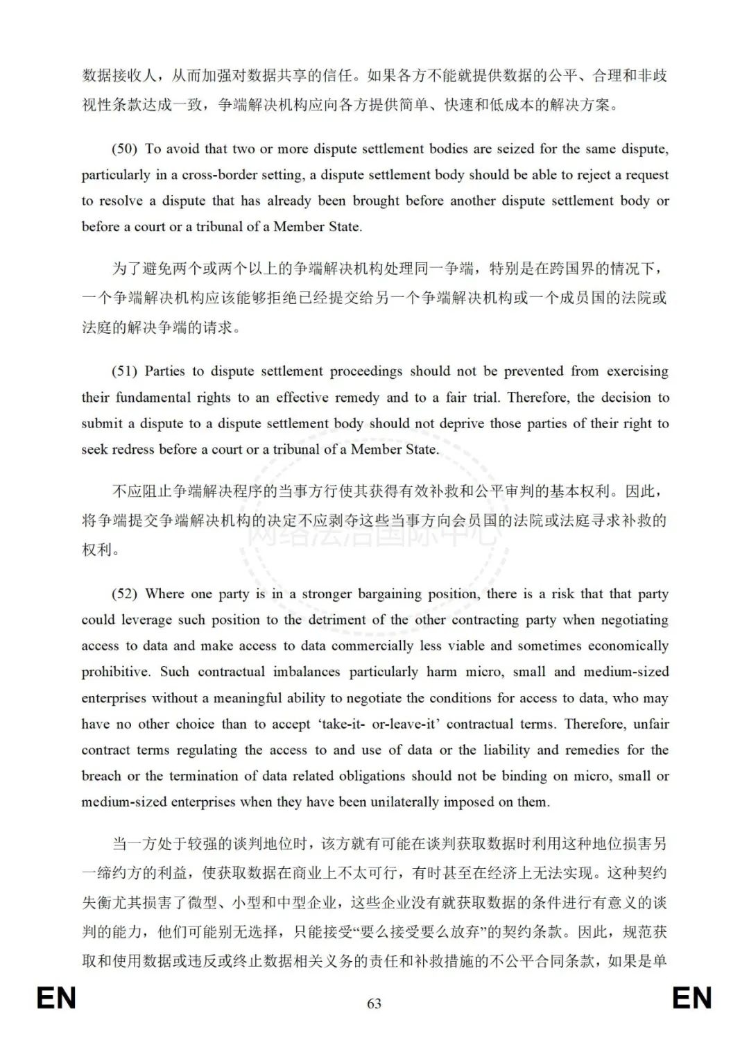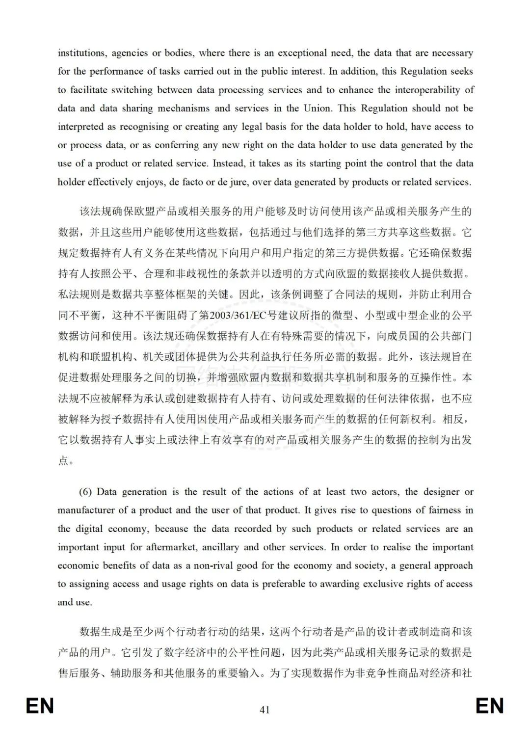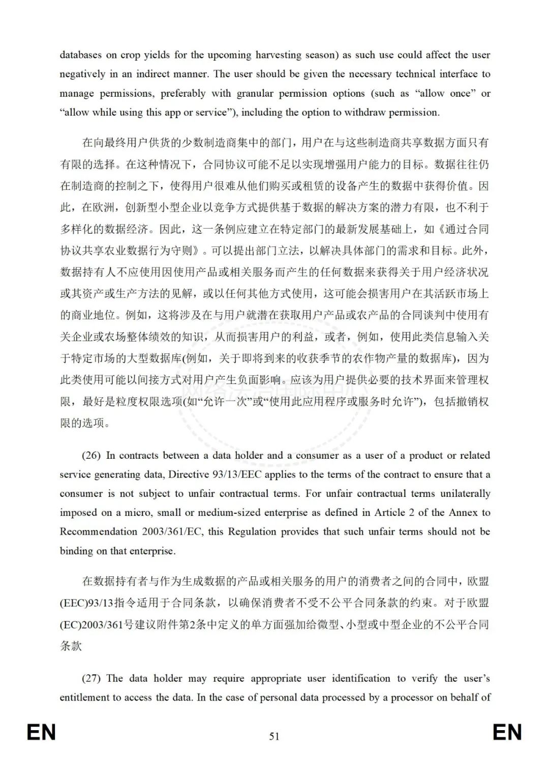 欧洲议会在其决议中还指出,企业对企业的合同协议不一定保证中小企业能够充分获取数据。这是因为在谈判能力和专业知识方面存在差距。因此,欧洲议会强调,合同需要规定明确的义务,并确定获取、处理、共享和存储数据的责任,以限制数据的滥用。(《法案》以下译文参阅下图)