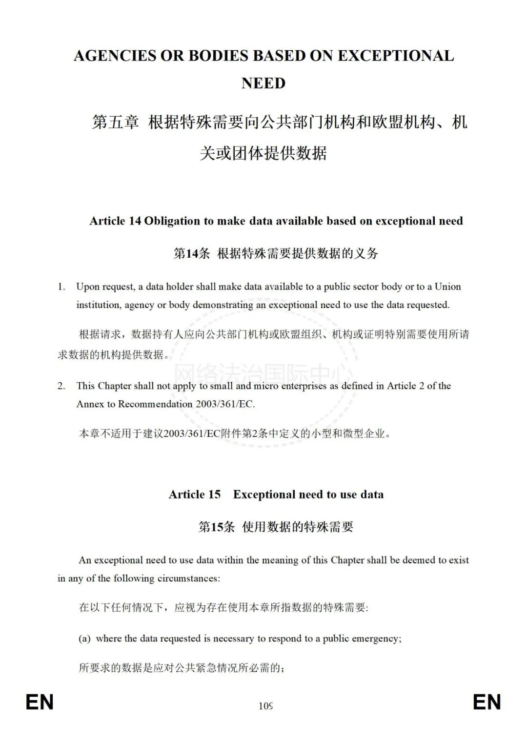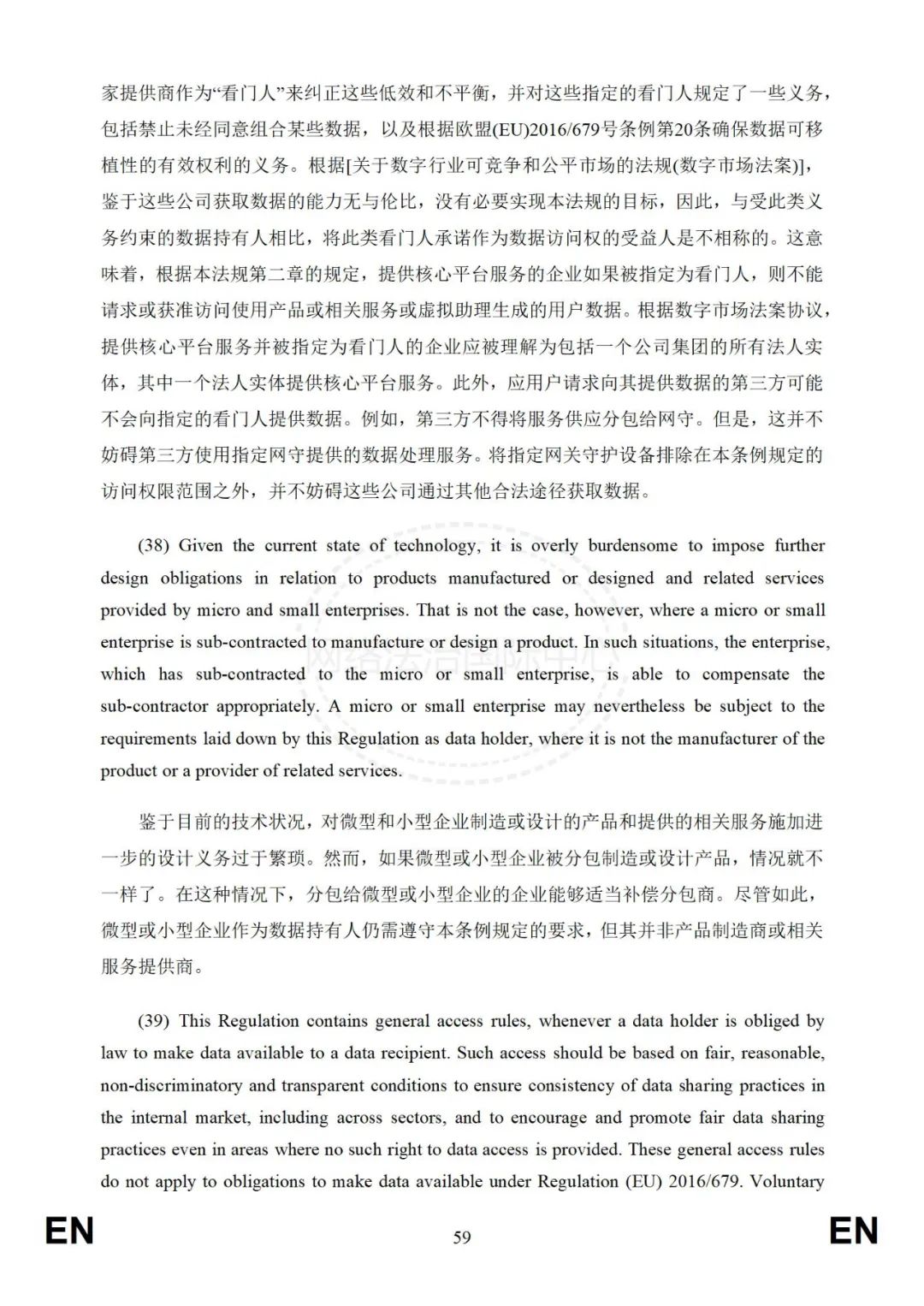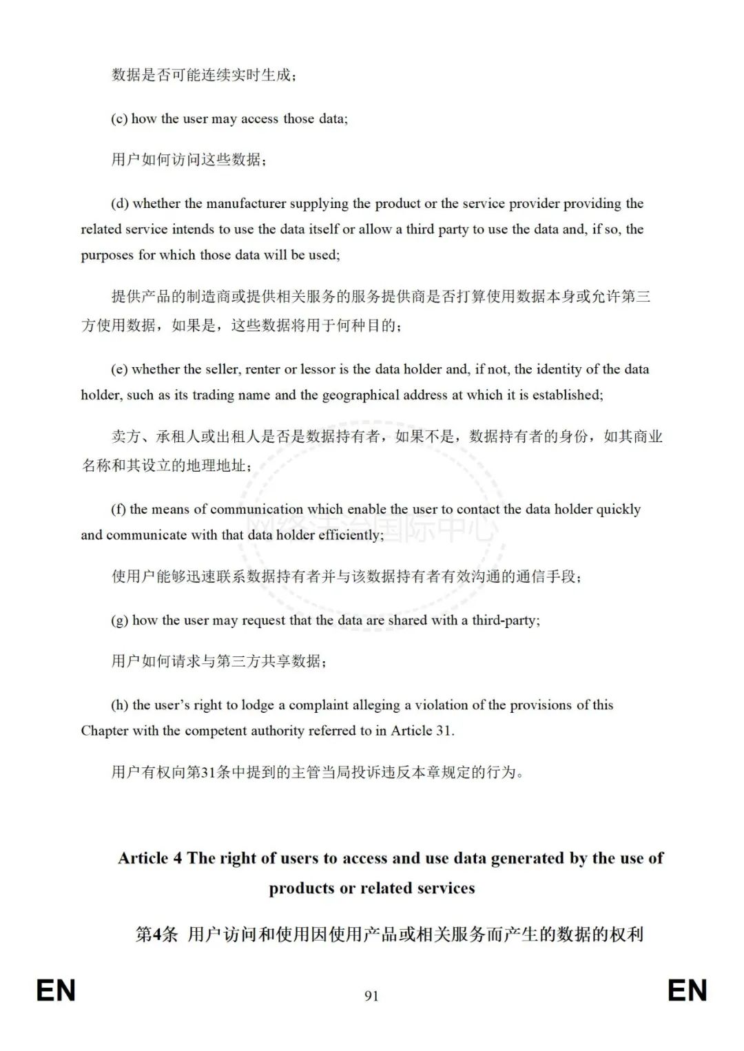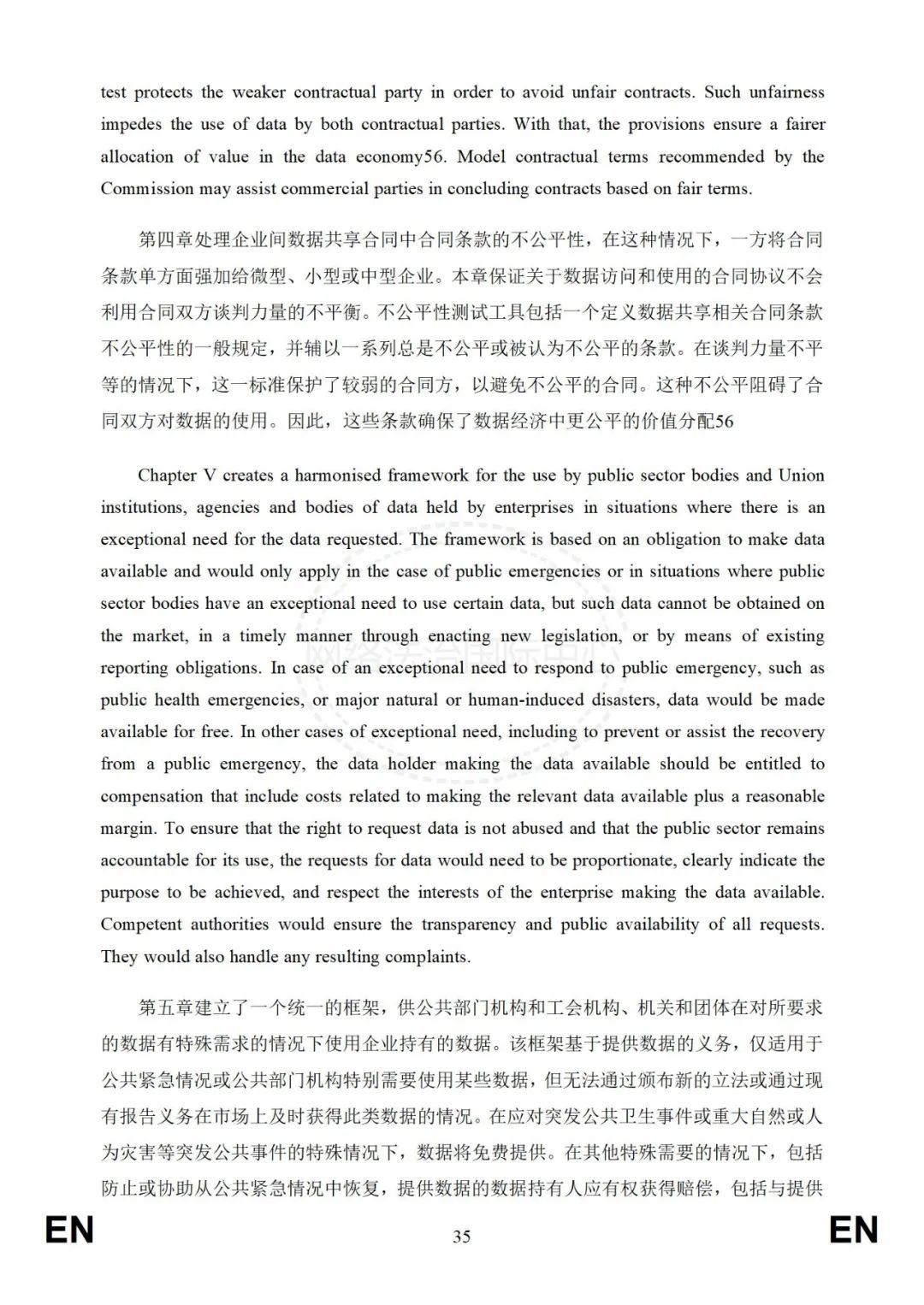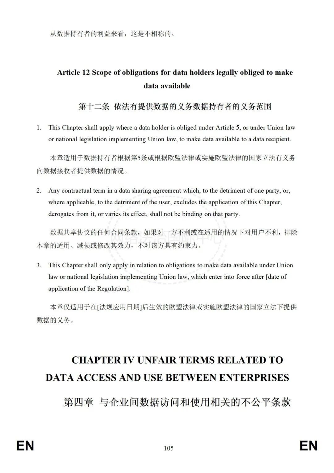 欧洲议会在其决议中还指出,企业对企业的合同协议不一定保证中小企业能够充分获取数据。这是因为在谈判能力和专业知识方面存在差距。因此,欧洲议会强调,合同需要规定明确的义务,并确定获取、处理、共享和存储数据的责任,以限制数据的滥用。(《法案》以下译文参阅下图)