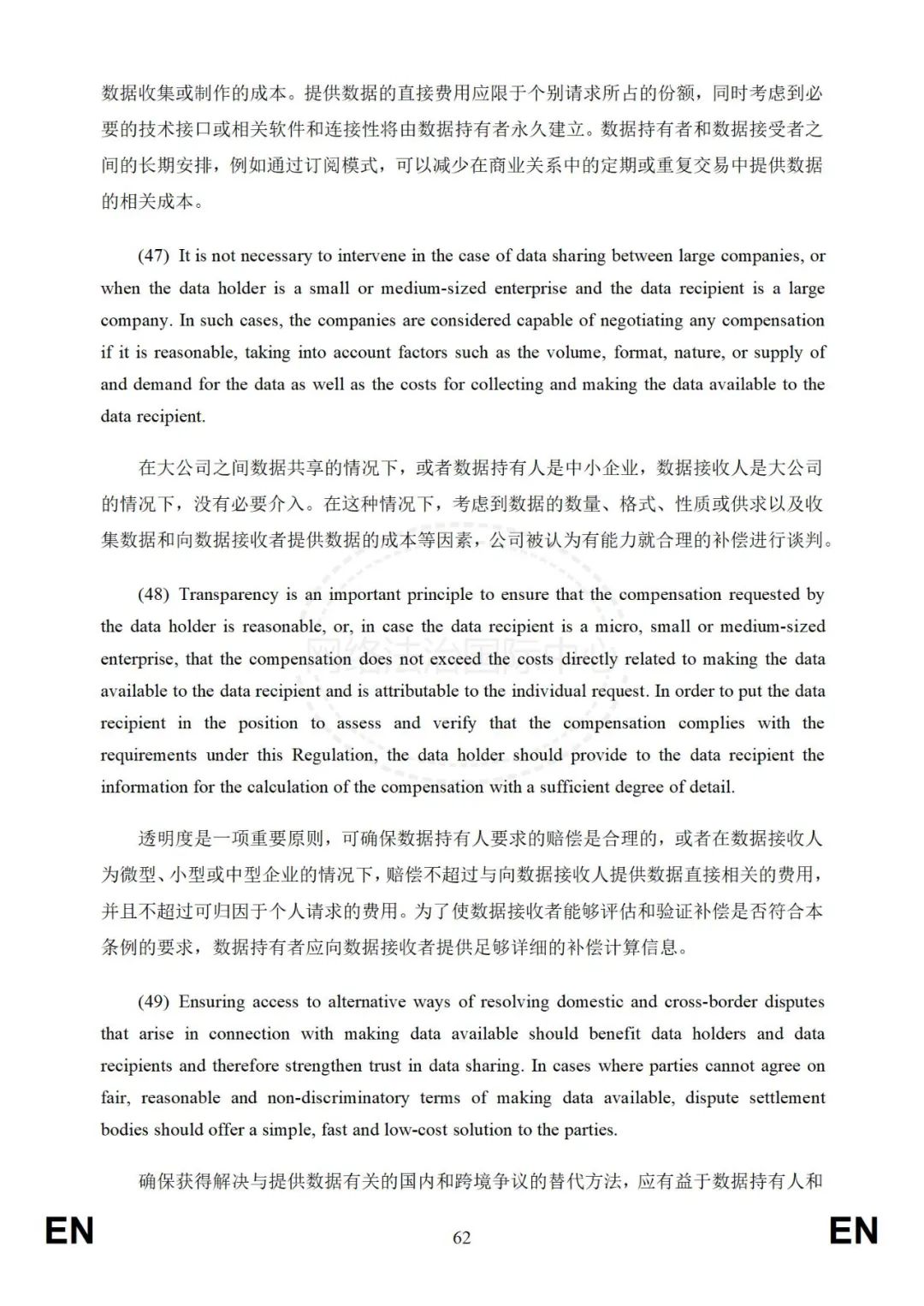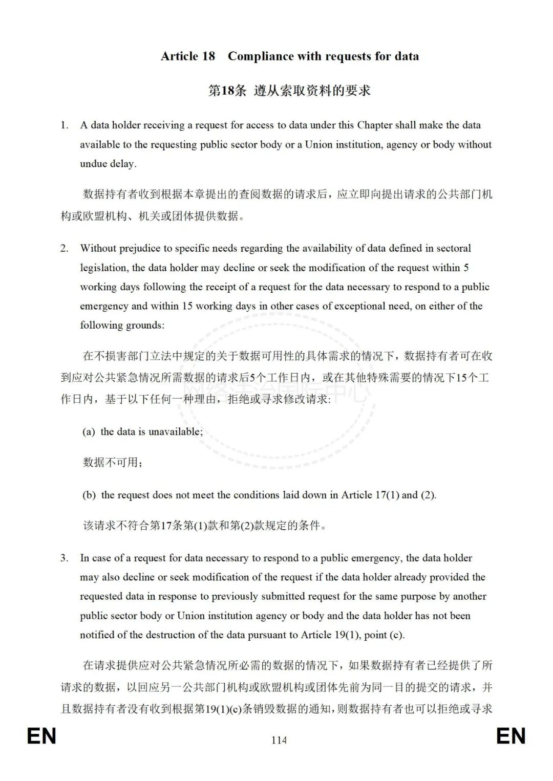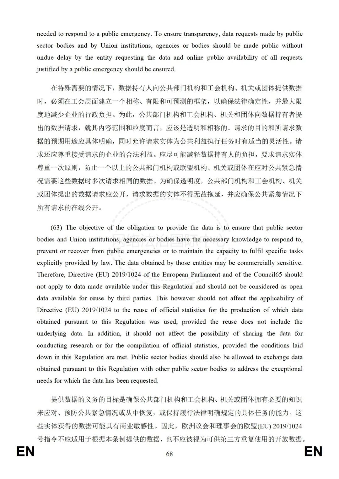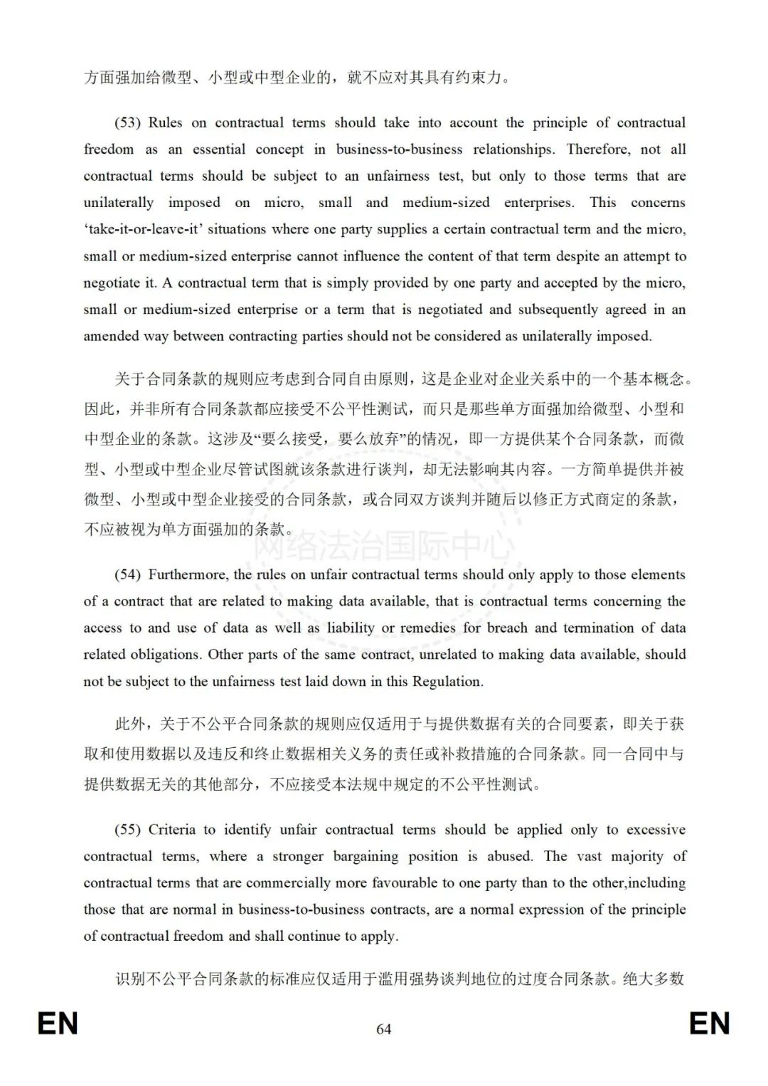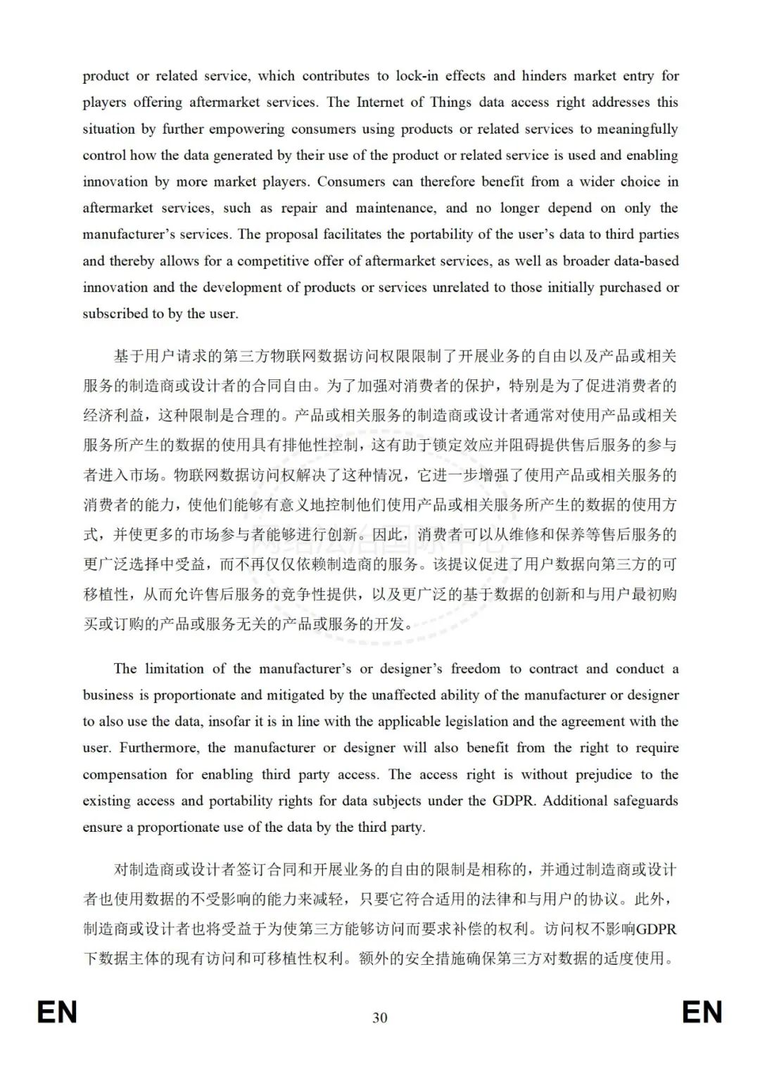 欧洲议会在其决议中还指出,企业对企业的合同协议不一定保证中小企业能够充分获取数据。这是因为在谈判能力和专业知识方面存在差距。因此,欧洲议会强调,合同需要规定明确的义务,并确定获取、处理、共享和存储数据的责任,以限制数据的滥用。(《法案》以下译文参阅下图)
