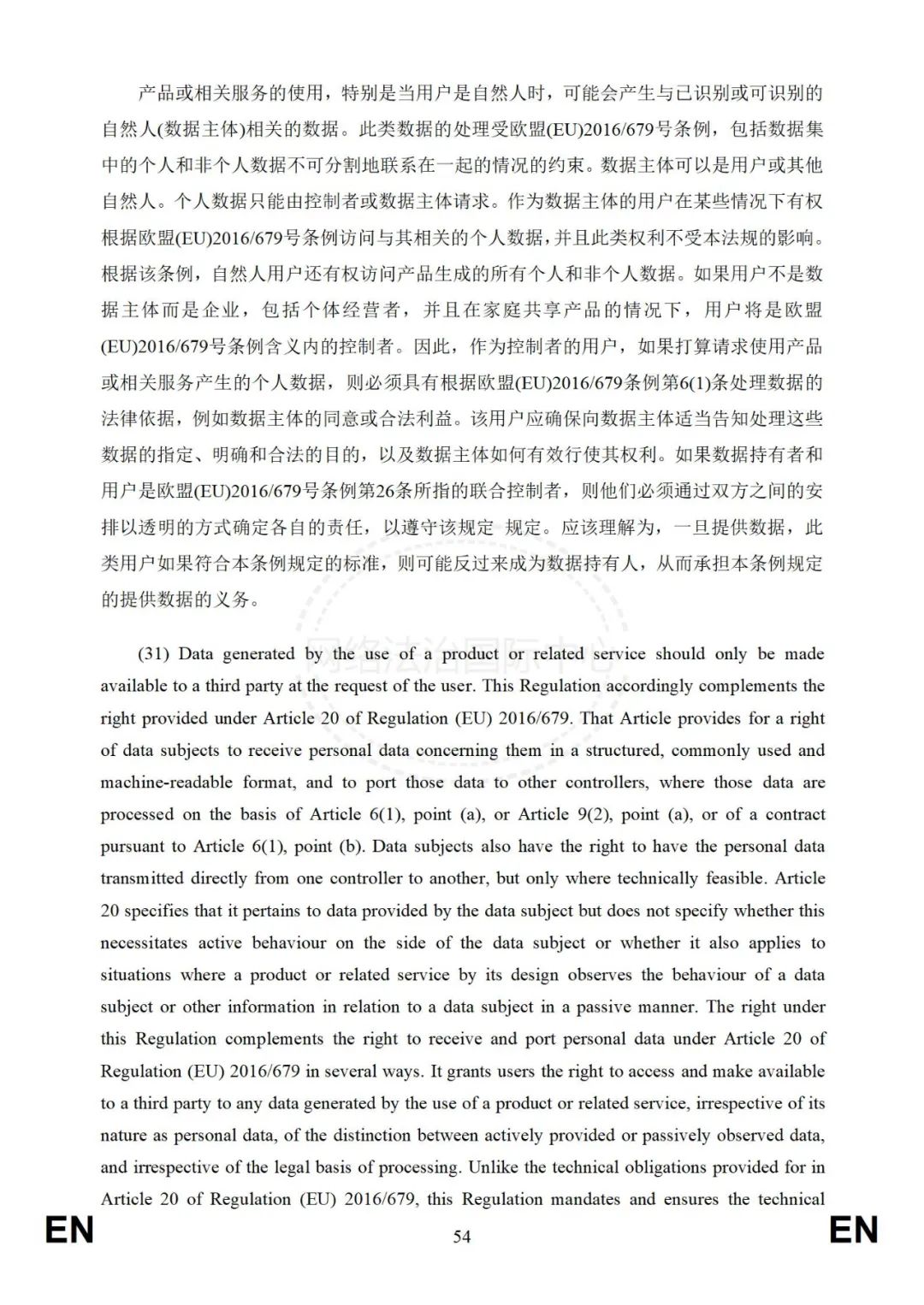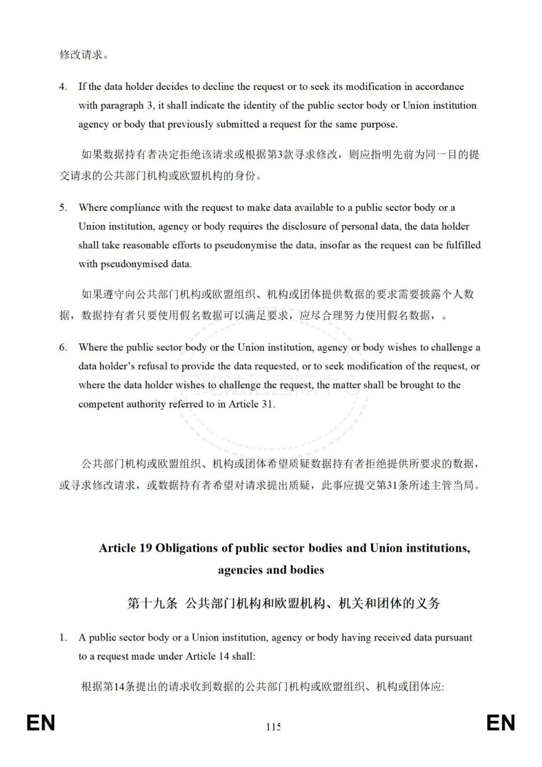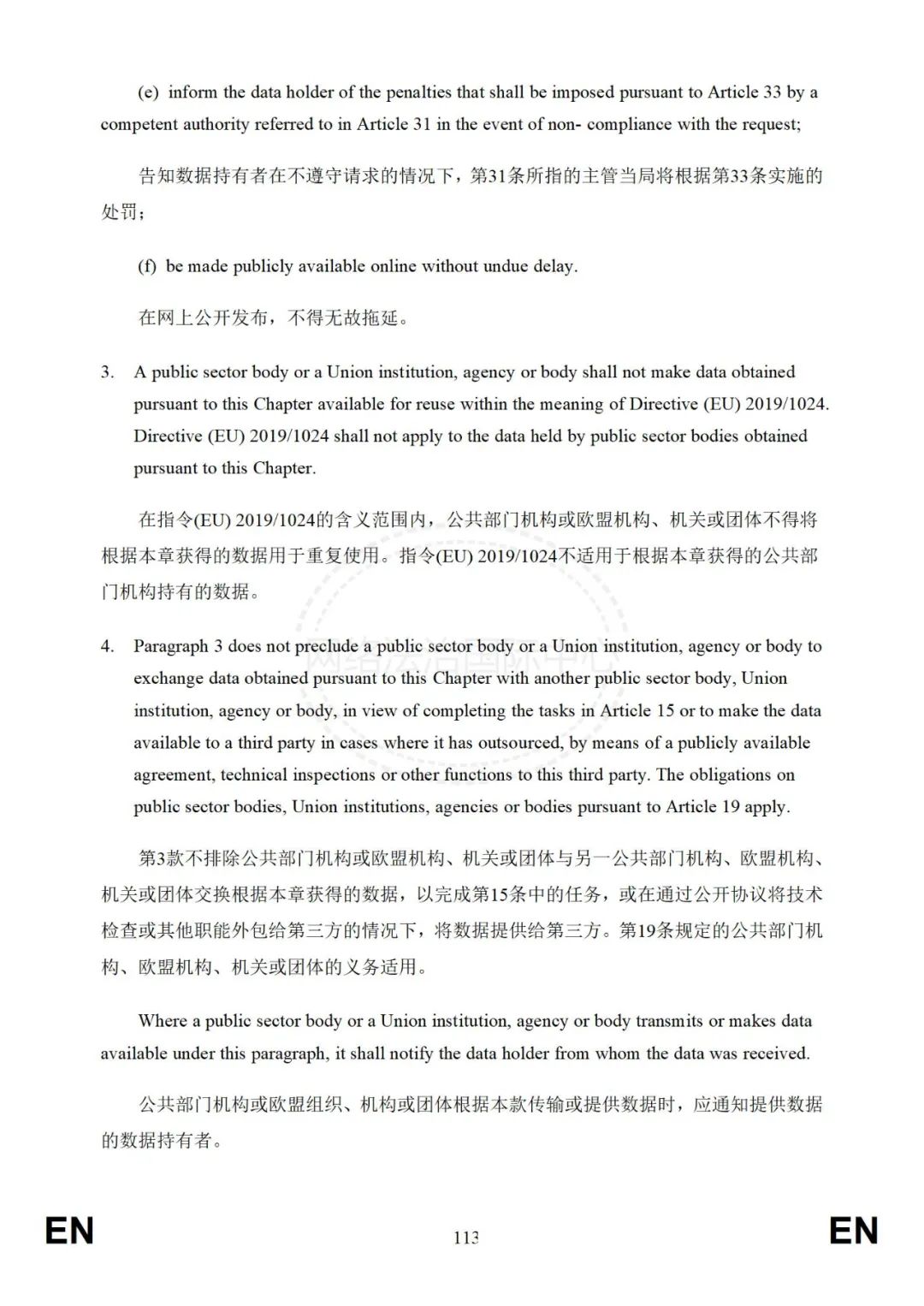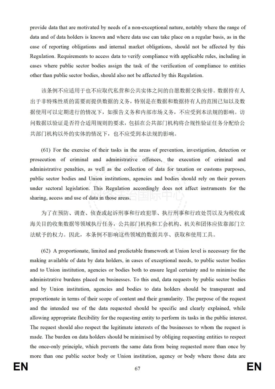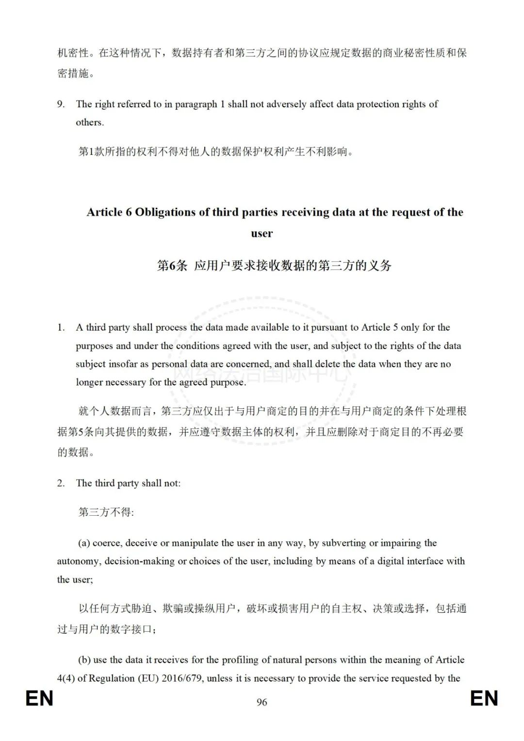 欧洲议会在其决议中还指出,企业对企业的合同协议不一定保证中小企业能够充分获取数据。这是因为在谈判能力和专业知识方面存在差距。因此,欧洲议会强调,合同需要规定明确的义务,并确定获取、处理、共享和存储数据的责任,以限制数据的滥用。(《法案》以下译文参阅下图)