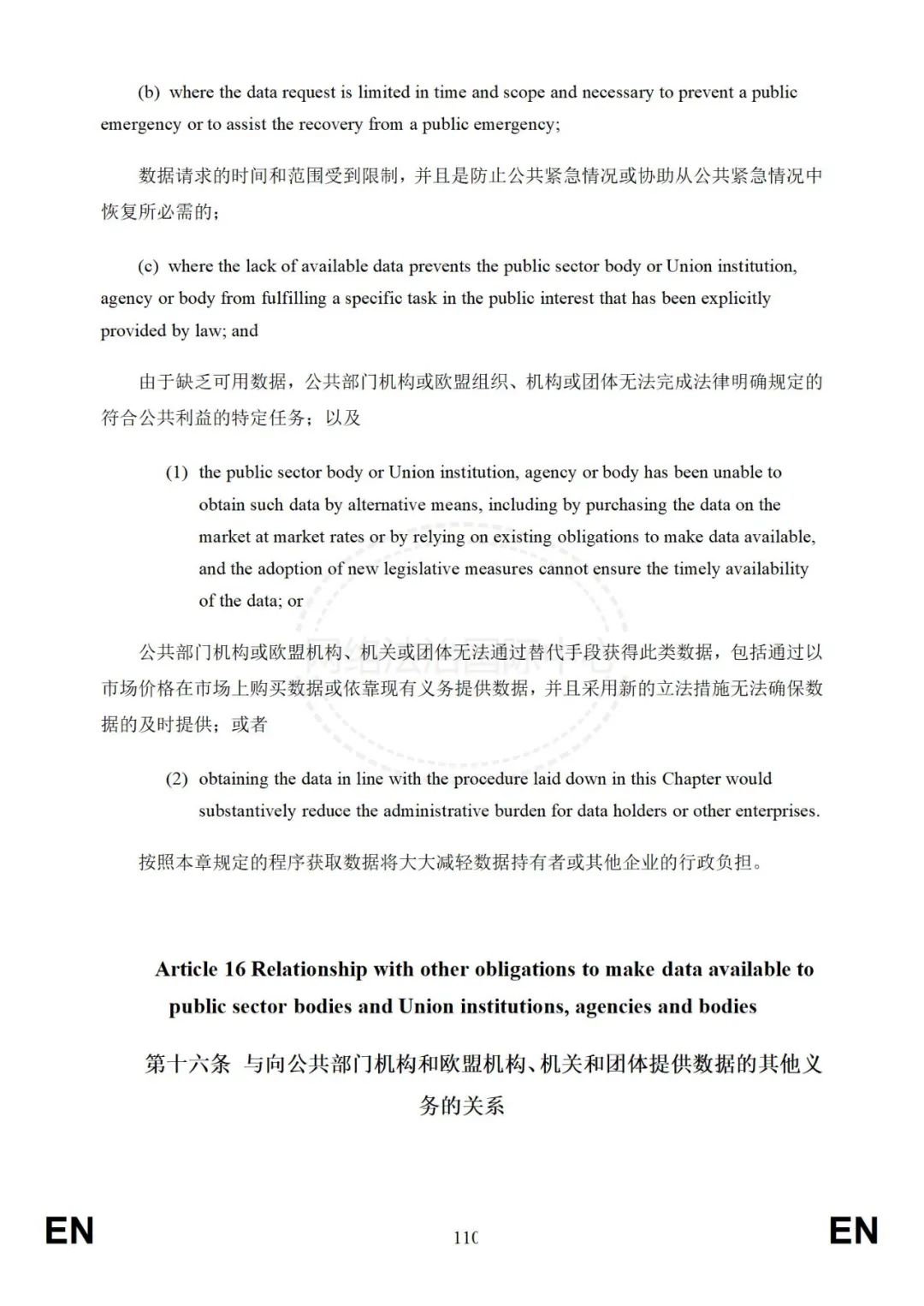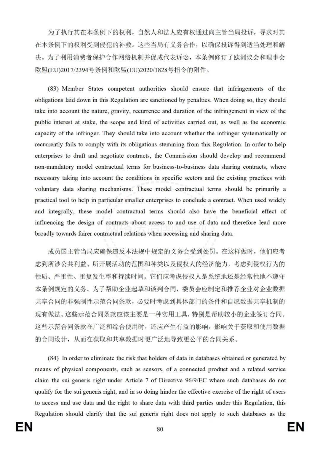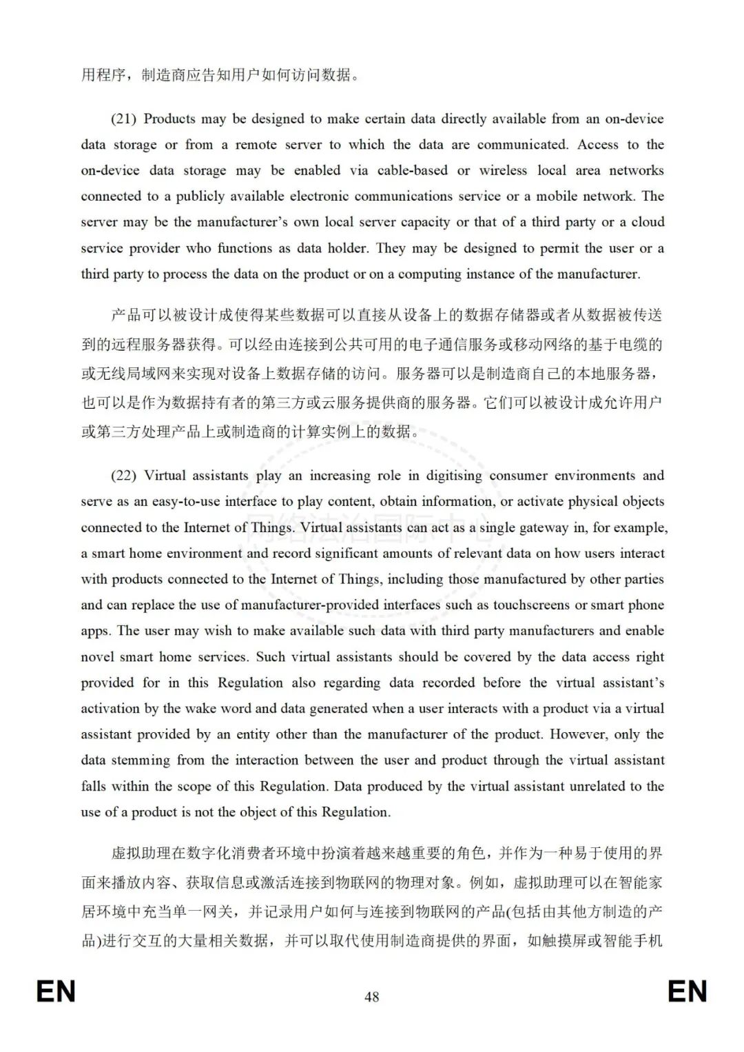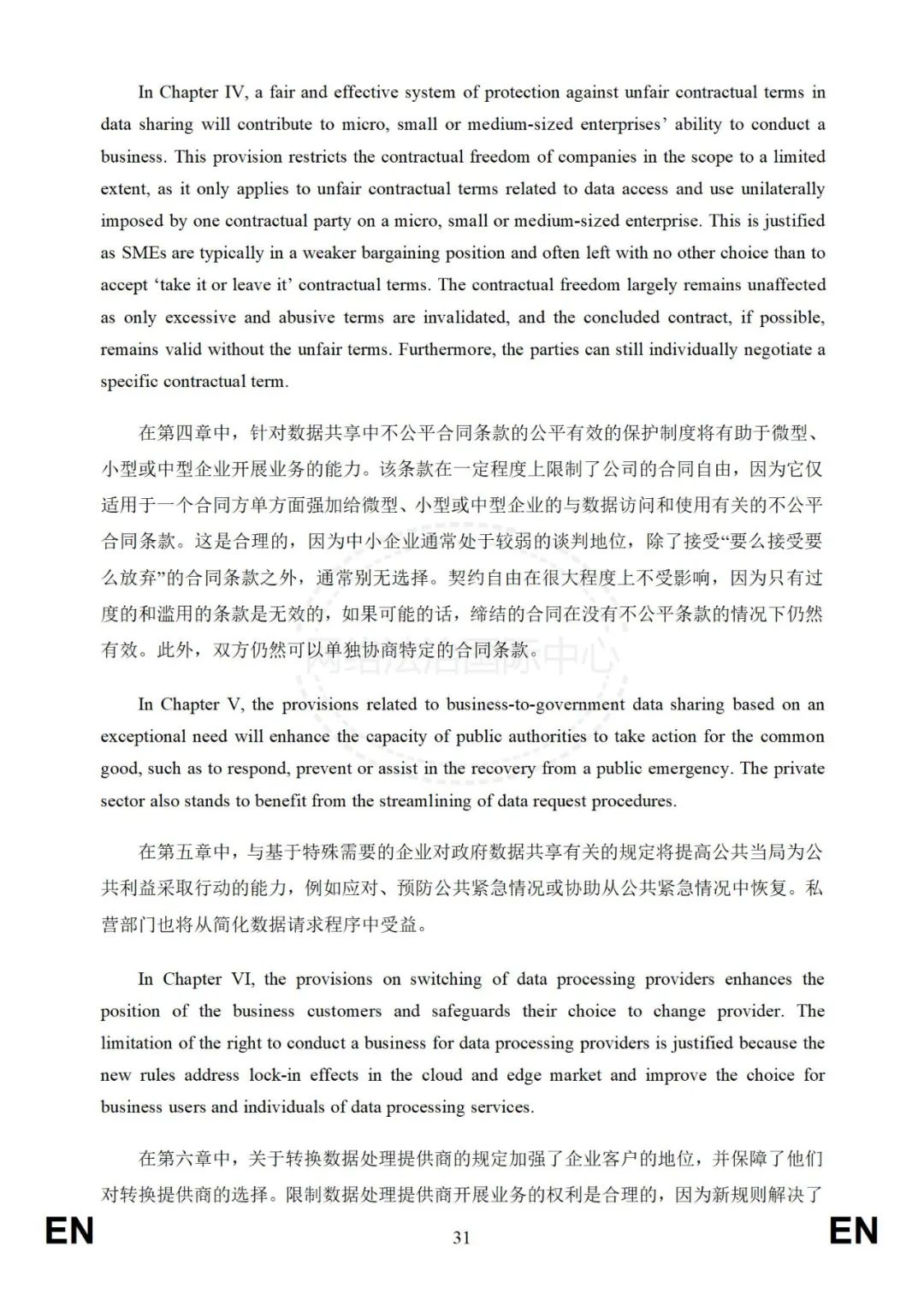 欧洲议会在其决议中还指出,企业对企业的合同协议不一定保证中小企业能够充分获取数据。这是因为在谈判能力和专业知识方面存在差距。因此,欧洲议会强调,合同需要规定明确的义务,并确定获取、处理、共享和存储数据的责任,以限制数据的滥用。(《法案》以下译文参阅下图)