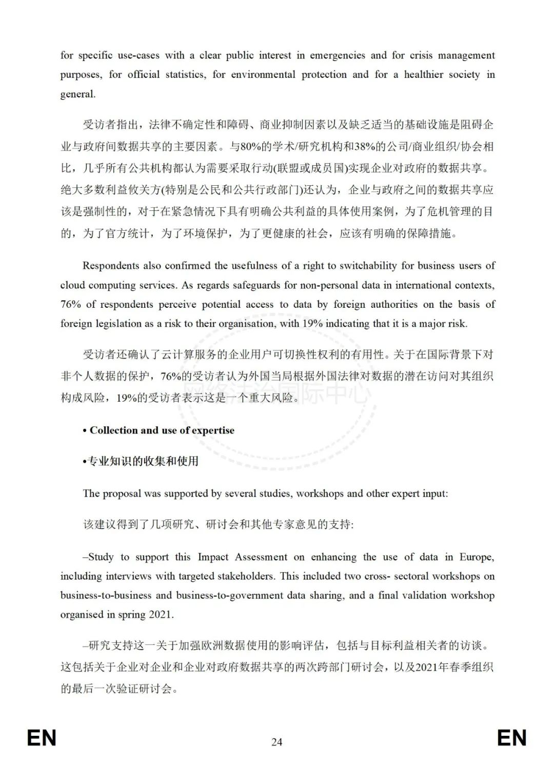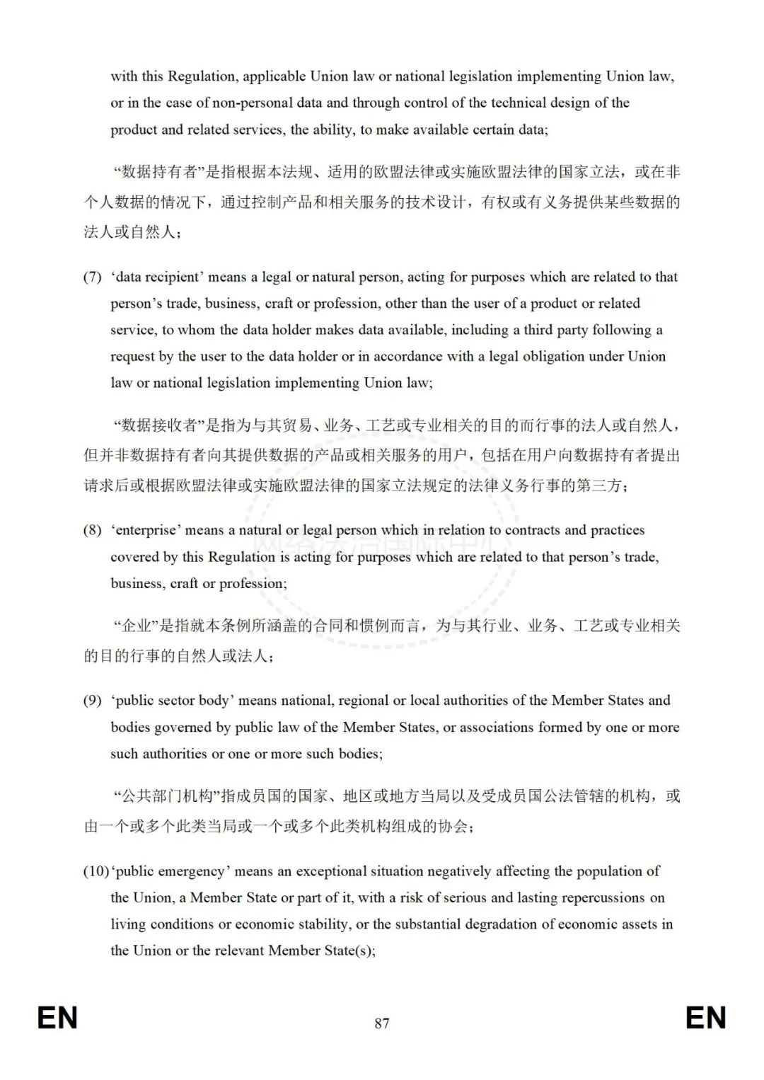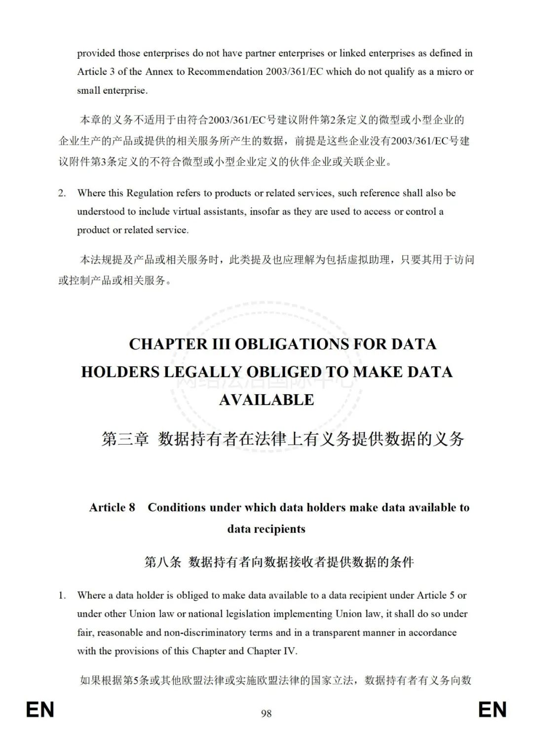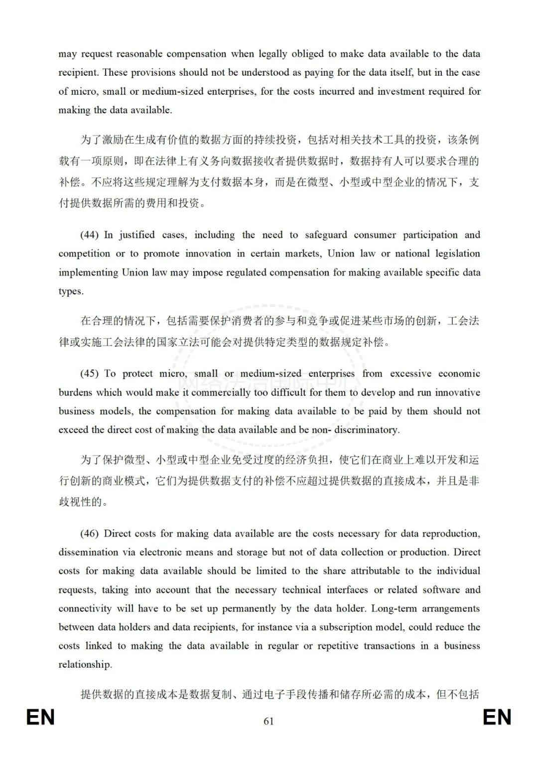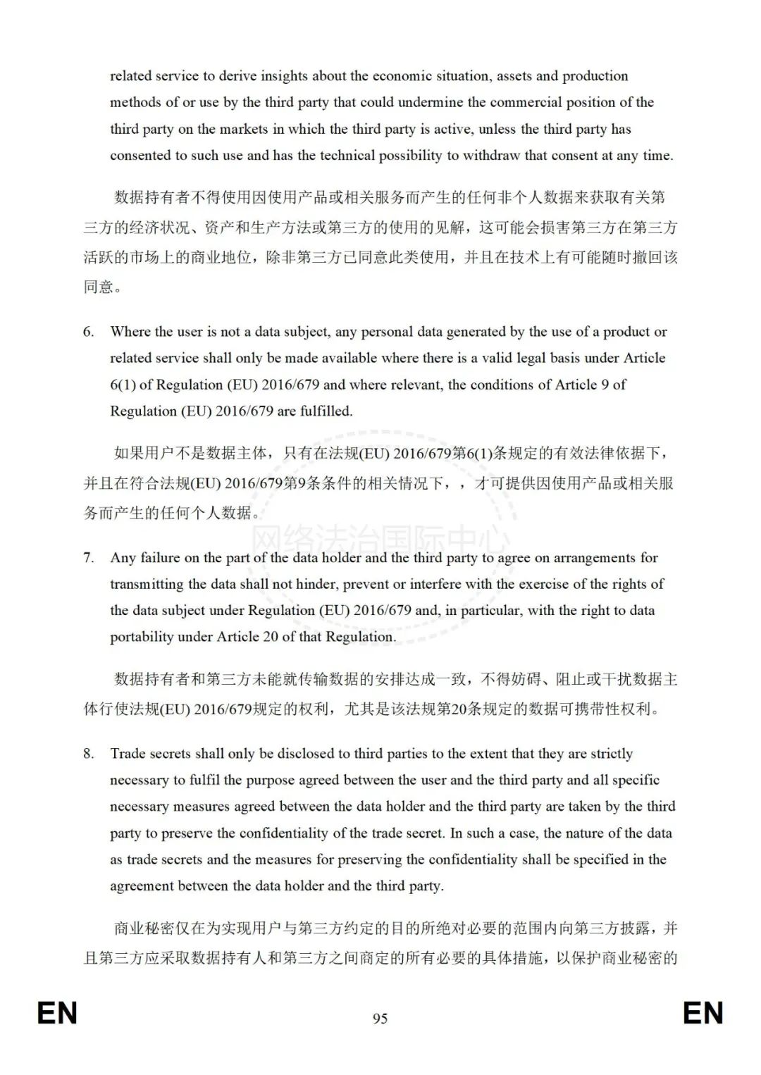 欧洲议会在其决议中还指出,企业对企业的合同协议不一定保证中小企业能够充分获取数据。这是因为在谈判能力和专业知识方面存在差距。因此,欧洲议会强调,合同需要规定明确的义务,并确定获取、处理、共享和存储数据的责任,以限制数据的滥用。(《法案》以下译文参阅下图)