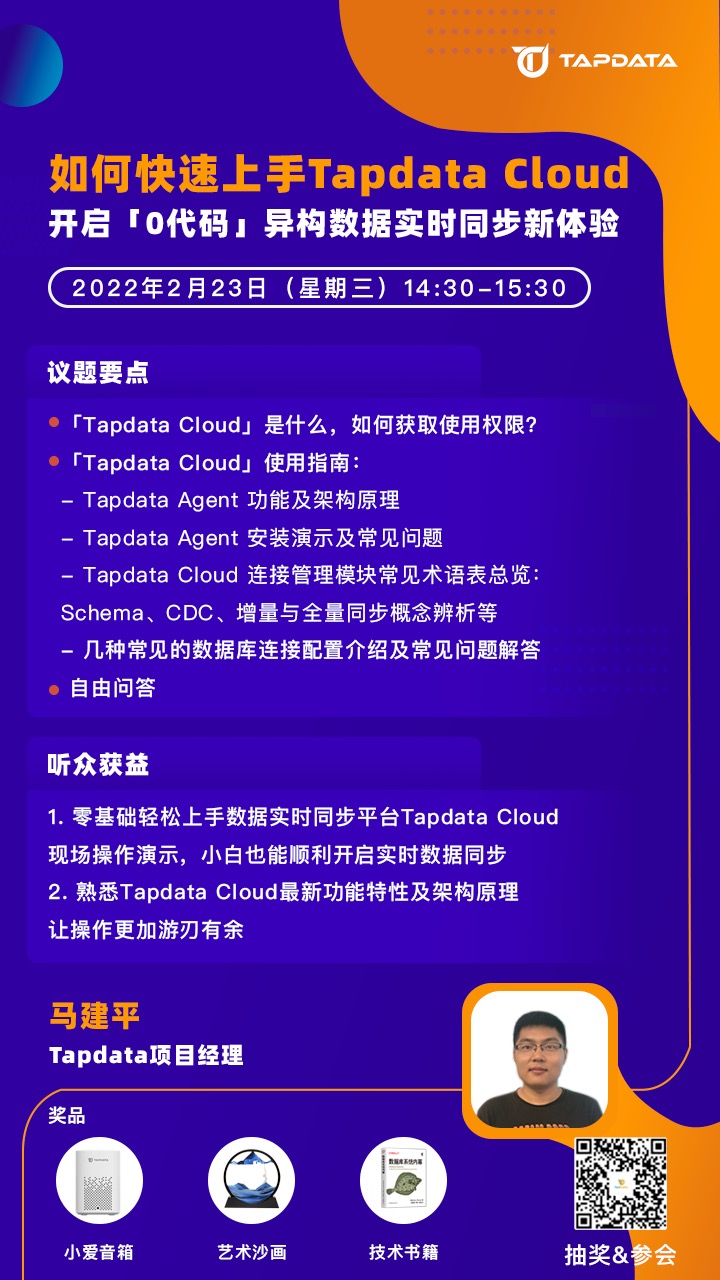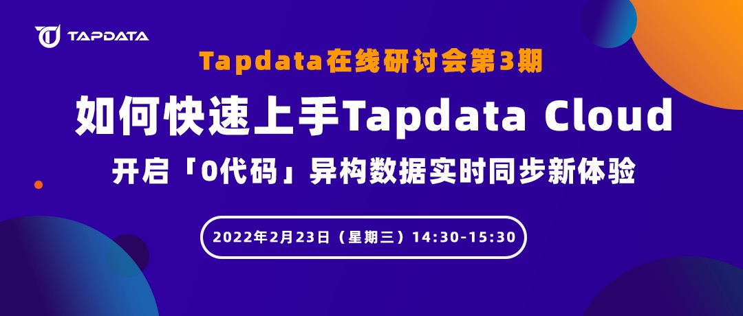 🗓2月23日下午14:30-15:30,Tapdata Cloud 在线研讨会第 3 期如约而至,Tapdata 项目经理马建平手把手教你零基础学习 Tapdata Cloud 相关术语、功能架构、操作方法……同时开放线上答疑,帮助解决你使用过程中的常见问题。