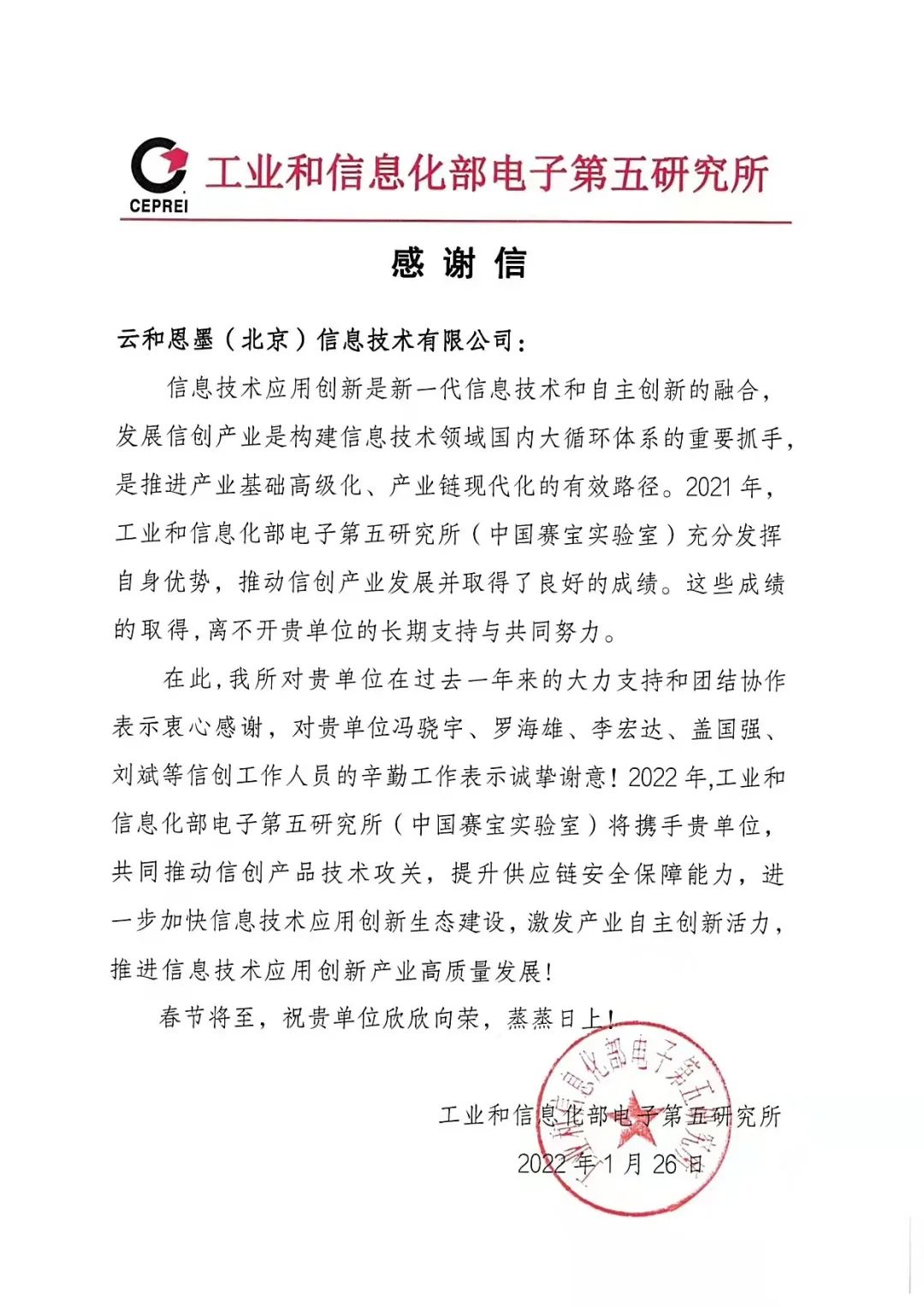 2021年,云和恩墨同工信部电子五所(中国赛宝实验室)充分发挥各自优势,紧密合作,共同推动了信创产业发展并取得了良好的成绩。