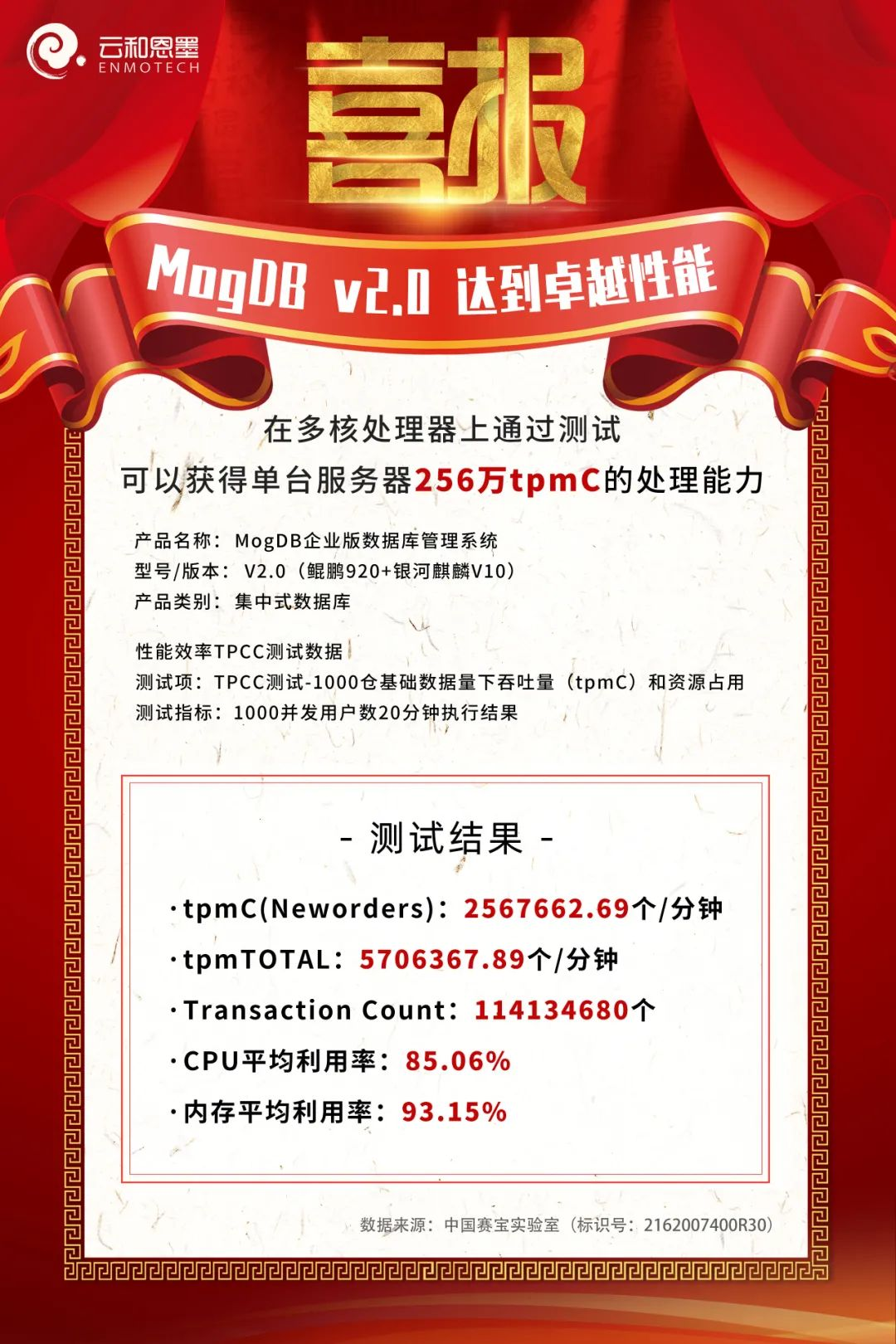 在赛宝实验室的评测中,云和恩墨凭借出色的技术能力,实现了两路服务器500并发145万的tpmC指标,四路服务器1000并发的256万tpmC指标,达到行业第一流水平。