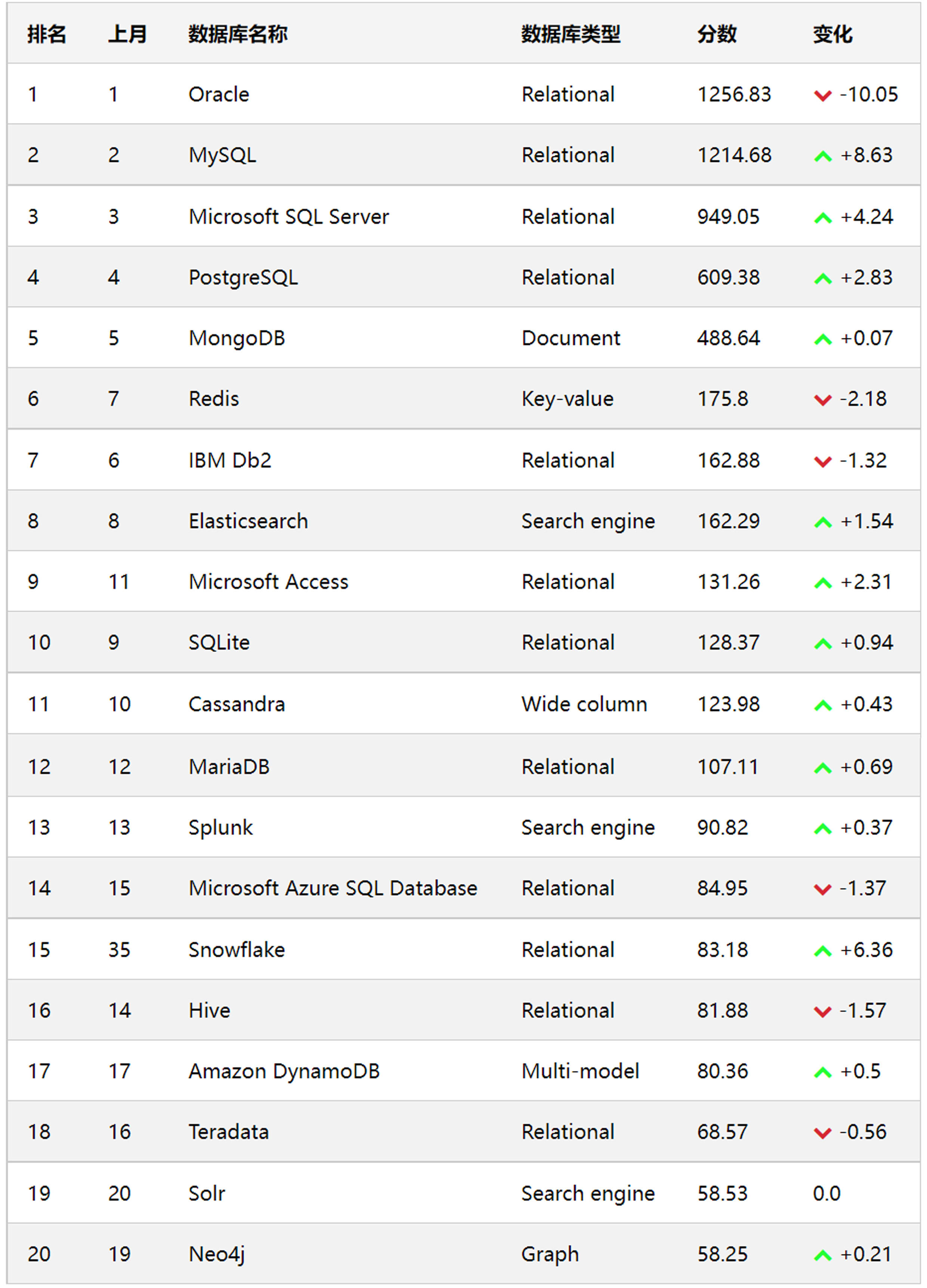 DB-Engines 排名是按人气排名,数据库涵盖 340 多个系统。 排名标准包括搜索系统名称时搜索引擎结果的必然要求,是企业级用户交易数据量、Google 趋势、 Stack Overflow 网站、客户信息LinkedIn、存货库存Twitter 等海量数据社交网络中的载体。