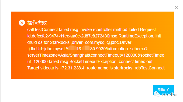 call testConnect failed.msg:invoke rcontroller method failed.Request id:db17012a-9546-11ec-b386-77dcdacb37d2msg:RuntimeException: init druid ds for StarRocks ,driver=com.mysql.cj.jdbc.Driver ,jdbcUrl=jdbc:mysql://**.**.**.80:9030/information_schema?serverTimezone=Asia/Shanghai&connectTimeout=120000&socketTimeout=120000 failed.msg:SocketTimeoutException: connect timed out. Target sidecar is 172.31.238.4, route name is startrocks_rdbTestConnect