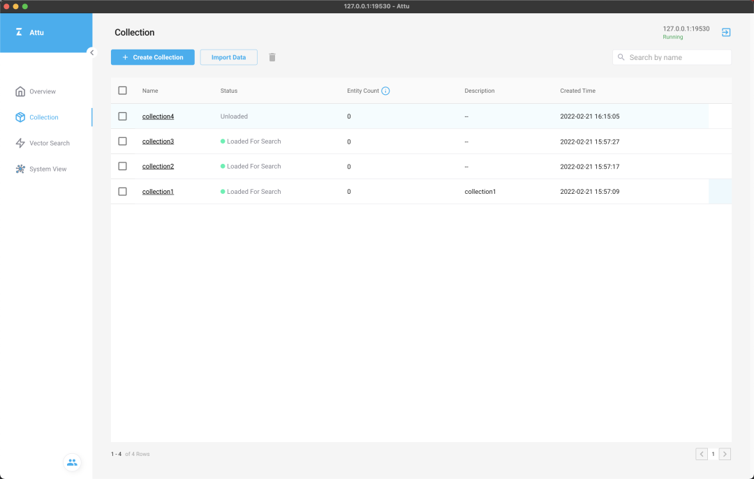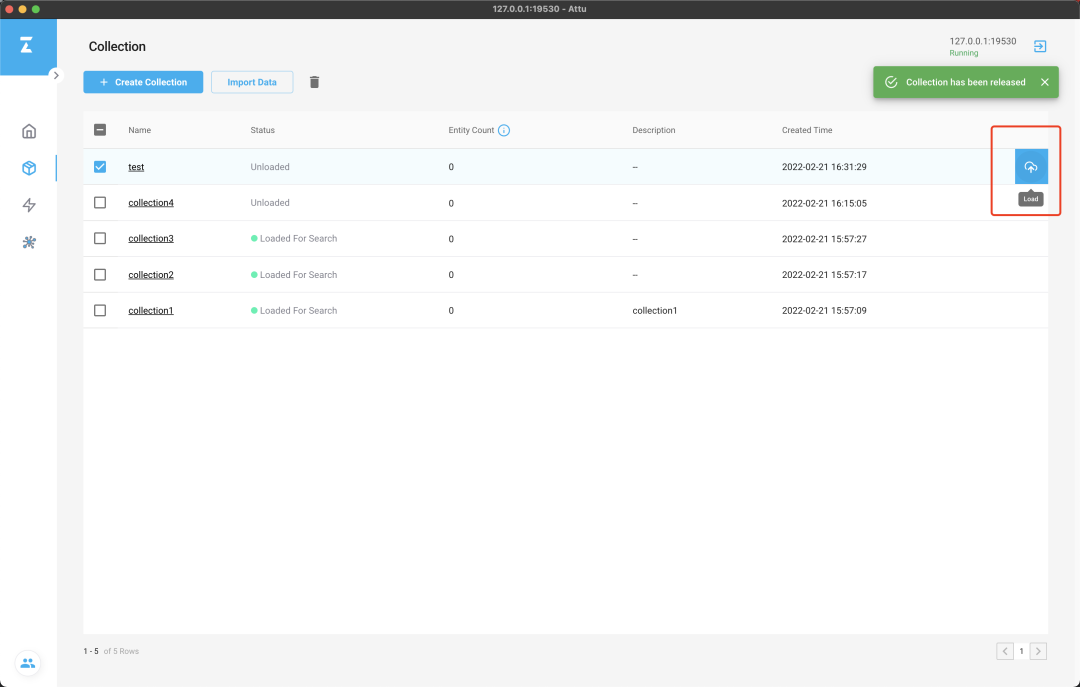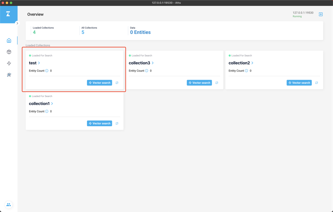 创建完毕后,点击 load,因为只有 loaded collection 才可以被搜索:此时在 overview 界面已经可以看到新创建的 test collection 了: