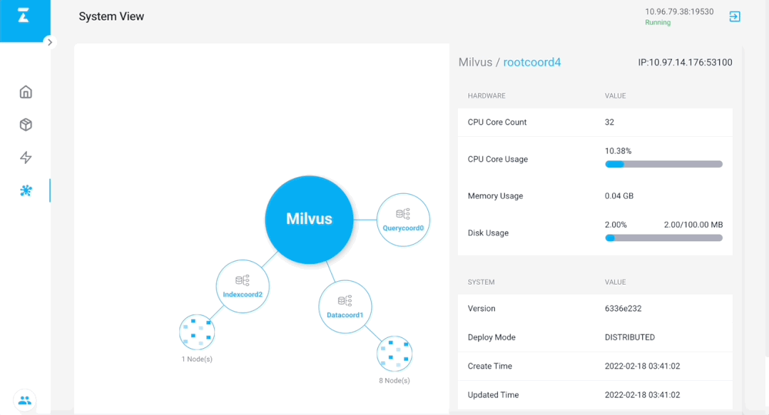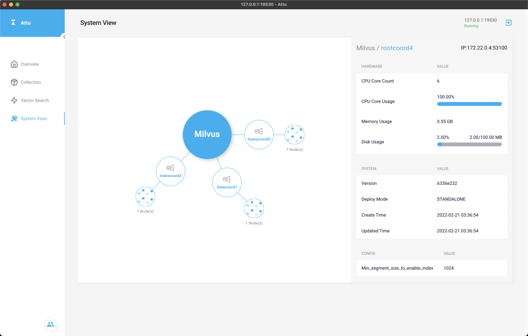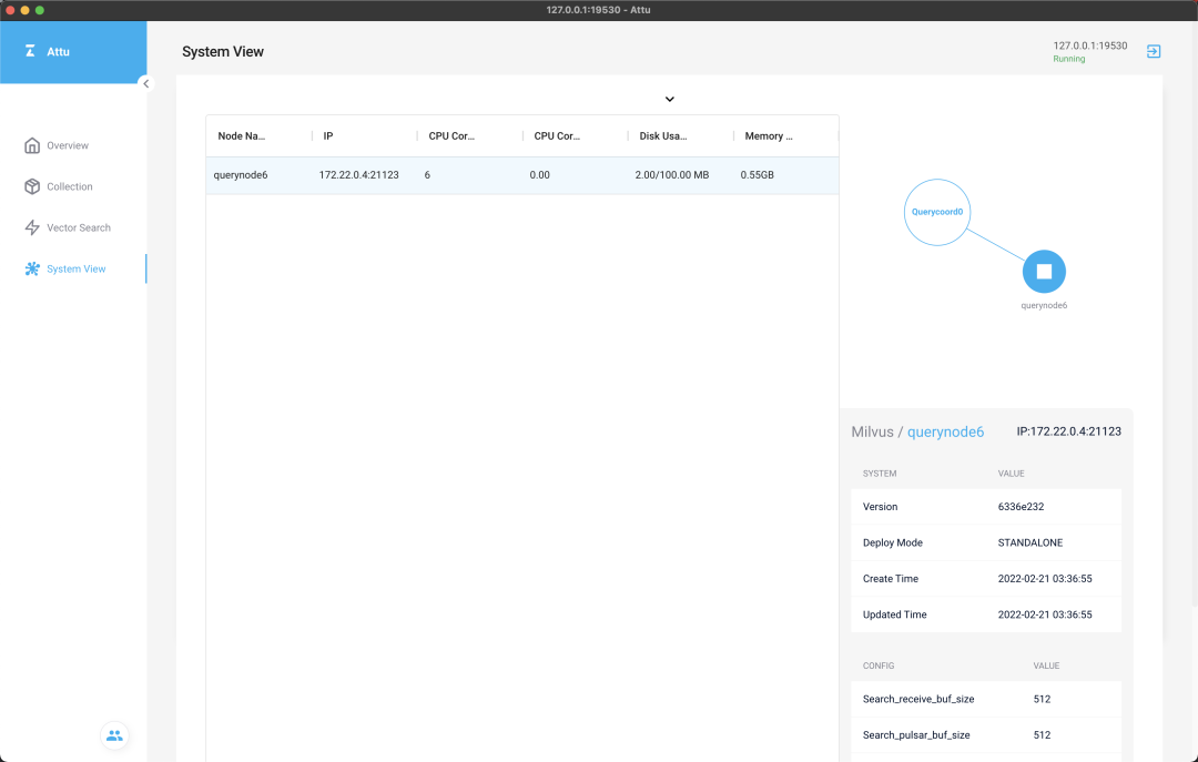 Vector Search 及 System View 两个标签页都是以插件的形式加载到 Attu 中的,关于插件的具体概念和使用方法将在文末详细介绍。其中,Vector Search 是用来进行向量搜索的界面:System View 以拓扑形式展现 Milvus 系统的结构,并详细列出每个节点的具体信息: