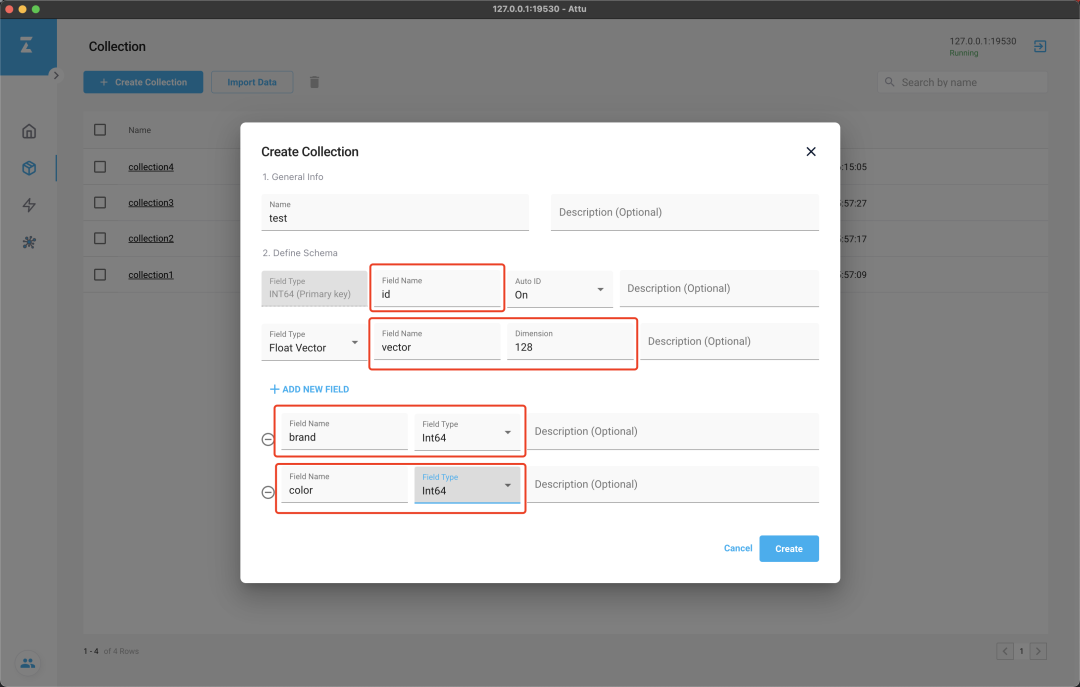 首先,在 collection 创建一个名为 test 的 collection,添加 4 个 field 分别为:Field Name: vector Dimension: 128Field Name: brand Field Type: Int64Field Name: color Field Type: Int64