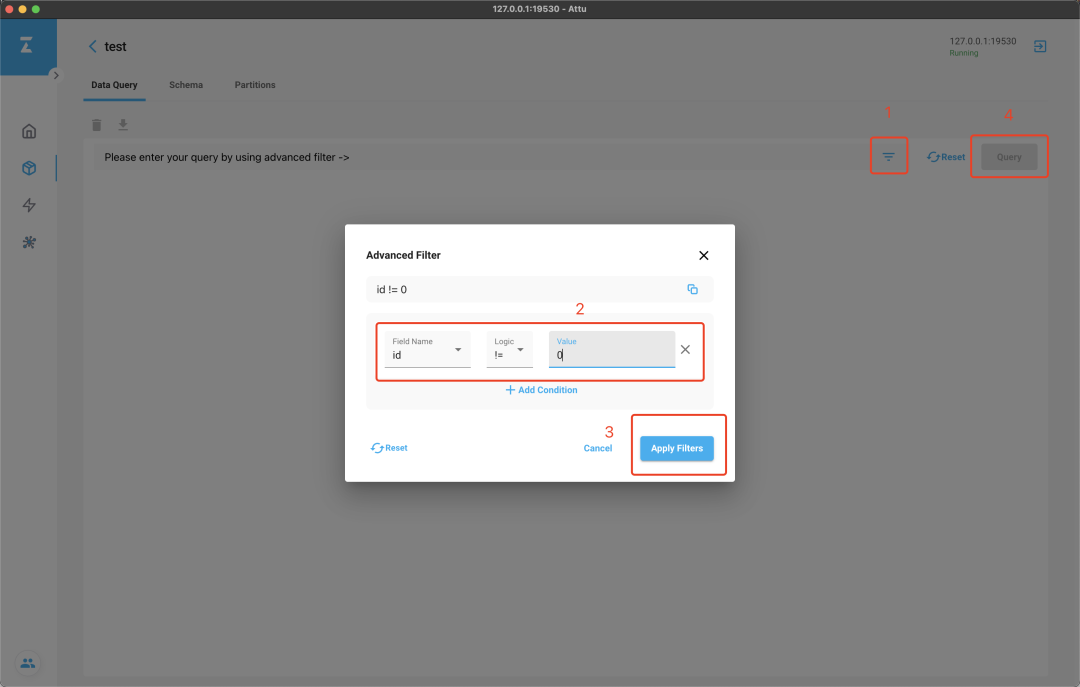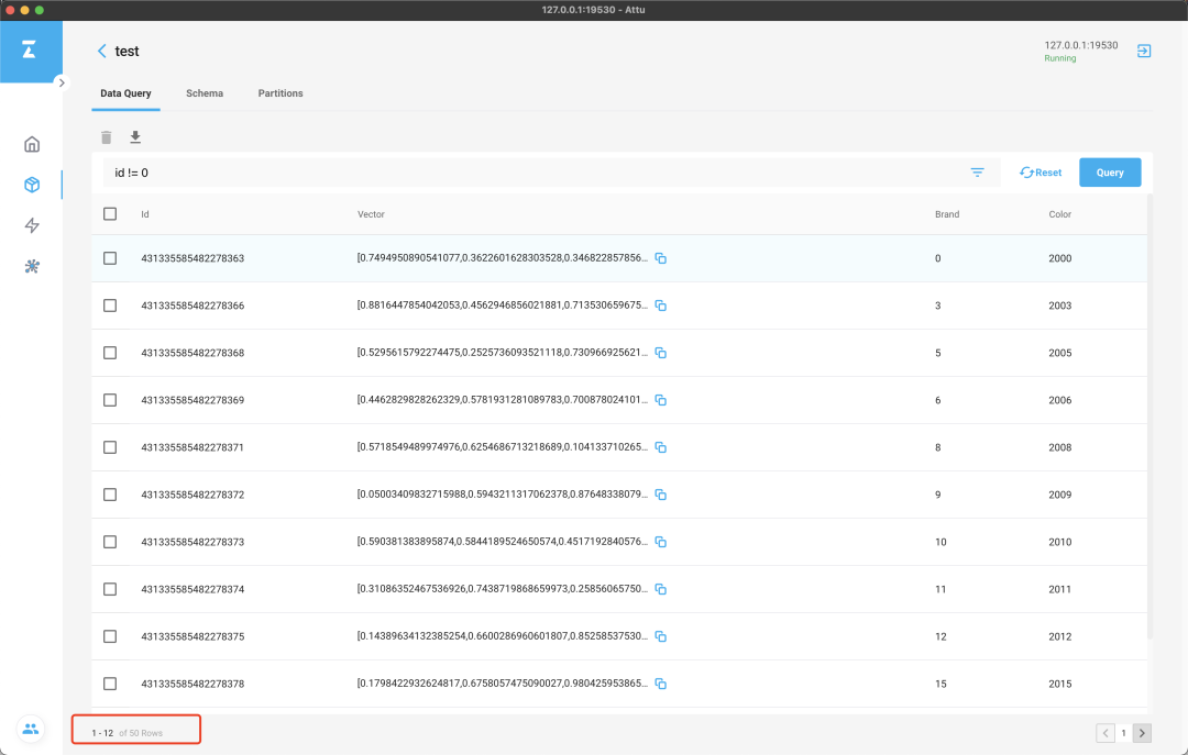 现在,我们来创建数据, import 预定义的测试数据 example_vectors.csv检查导入的数据,在 Overview 或者 Collection 界面点击 collection name 可以进入 query 界面。添加 filter (1),新增条件 id != 0