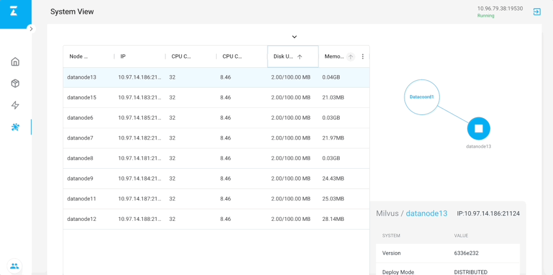 在 vector value 中贴入 search_vectors.csv 文件中的其中一条记录,然后选择 test collection,点击 search:可以看到向量间的距离计算的结果,也不需要写代码,就能快速验证向量搜索的结果,非常方便。由于目前仅有 node sdk 封装了 metrics api,该 api 可以实时获取 Milvus 目前系统状态、节点间关系、以及每个节点自身的状态。作为 Attu 的特有功能,System View 包含了一张完整的 Milvus 系统拓扑图,点击拓扑图中的每个节点,可以了解到节点自身的状态变化(每 10 秒动态刷新)。点击具体子节点,可以进入 node list view,该视图用来查看每个 coord 下管理的所有子节点列表及状态。通过排序,可以迅速定位到高 CPU 占用或者高内存占用节点,方便排查问题。