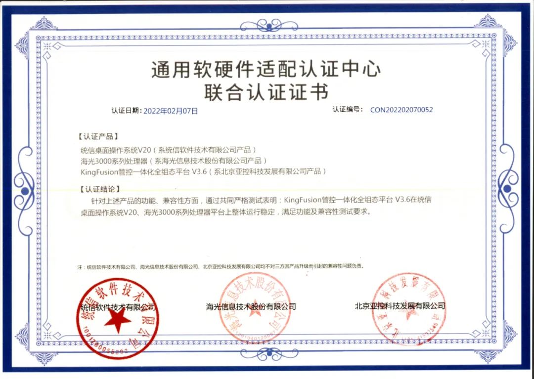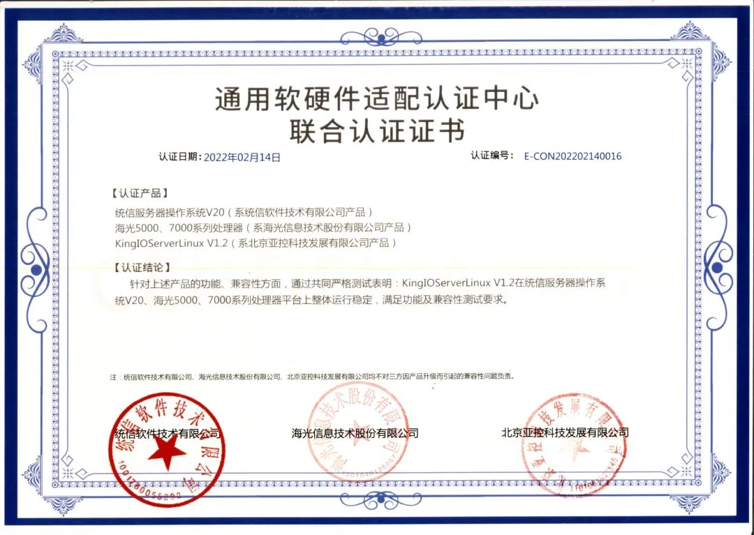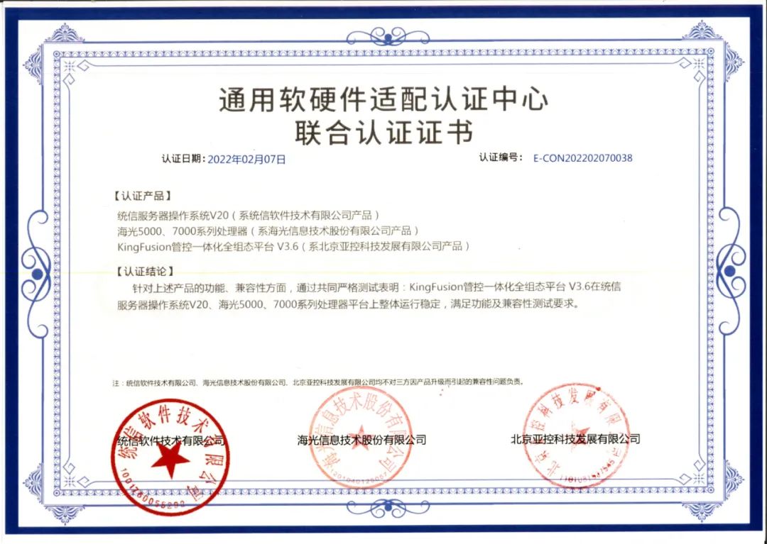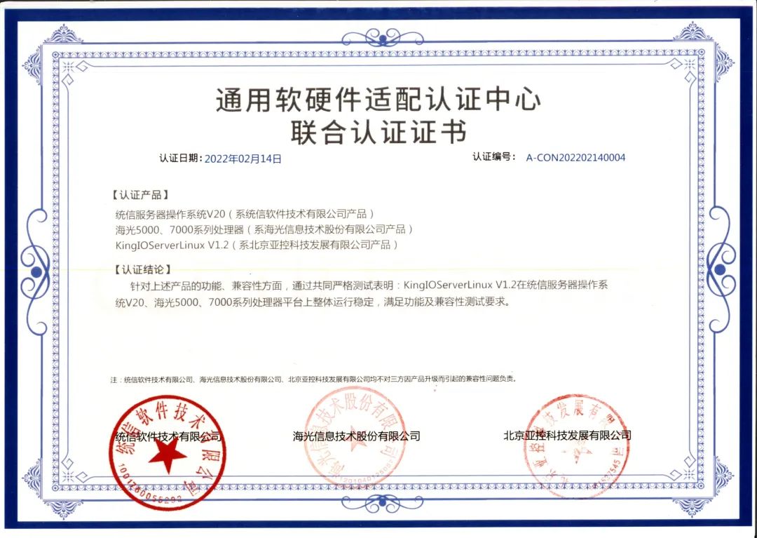 经过三方一系列全面严谨的认证测试后,三方认定亚控科技KingFusion系列产品与统信服务器操作系统V20、统信桌面操作系统V20、海光3000、5000、7000系列处理器平台产品、亚控科技KingIOServerLinux V1.2系列产品与统信服务器操作系统V20、海光5000、7000系列处理器平台产品互相兼容,性能卓越,且整体系统运行稳定。