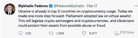 2月17日,乌克兰正式宣布比特币等加密货币的合法化。乌克兰数字化转型部长米哈伊洛·费德罗夫(Mykhailo Federov)在推特上表示,此举将降低腐败风险并防止新兴数字货币交易所滋生欺诈行为。
