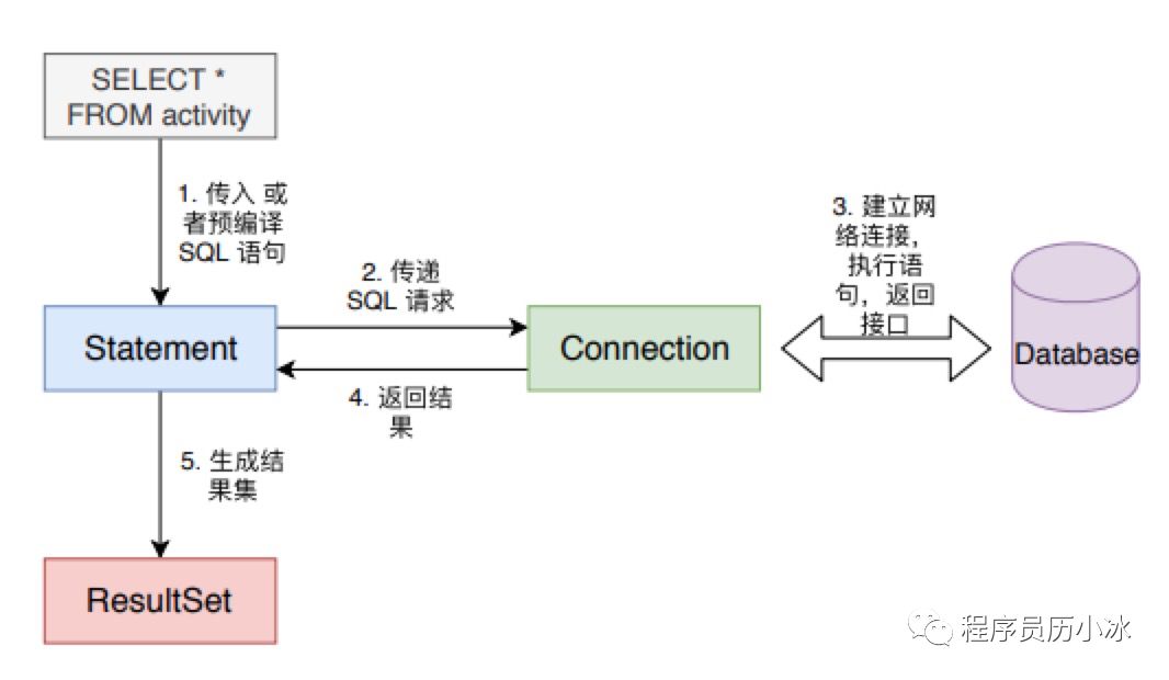 当程序加载完具体驱动实现后,接下来就是建立与数据库的连接,执行 SQL 语句并且处理返回结果了,其过程如下图所示。