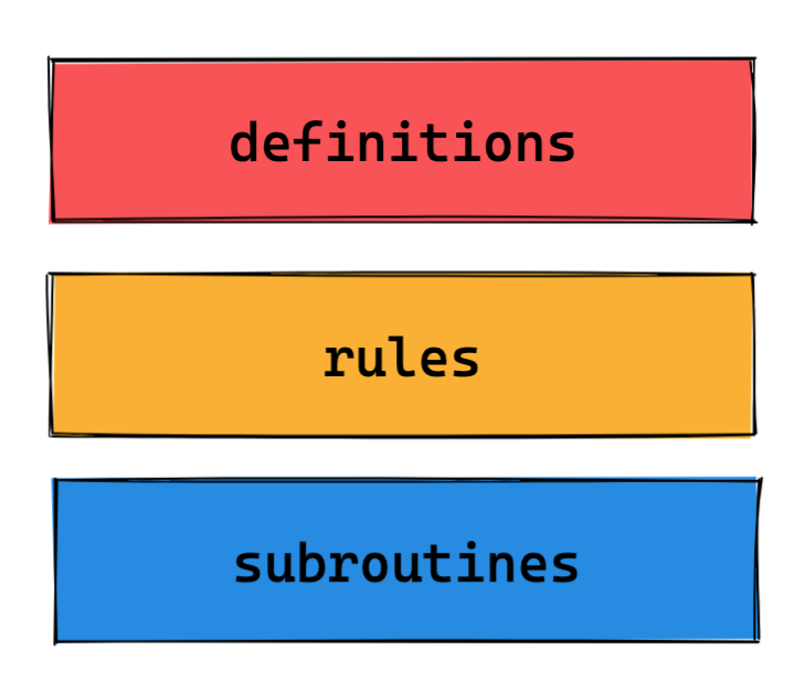 如上面例子所示,可以说.y文件是非常重要的,只有编写好了.y文件,我们才可以通过goyacc程序把它转化成语法解析器。而这个.y文件就是我们前面科普的语法规则文件,它主要由三部分组成。
