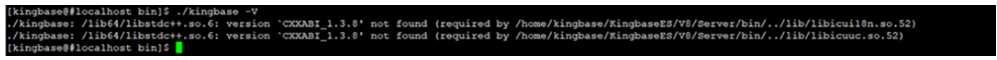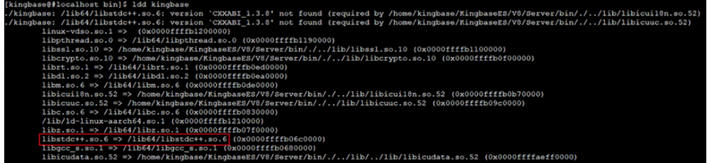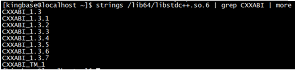 验证操作系统 libstdc++.so.6 文件,确认确实不包含kingbase程序所需要的 CXXABI_1.3.8 版本。
