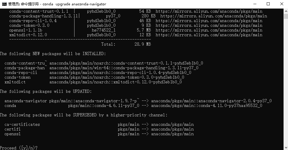 变更阿里云镜像源之后再进行升级,输入命令后选择Y