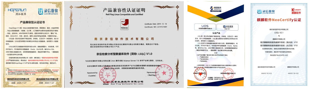 早在正式成为“信创工委会”成员单位之前,录信便一直致力于主动构建符合当下信息技术创新背景,适配国产软硬件平台的国产化生态建设之路。截止目前,录信数软旗下产品:万亿实时数仓LSQL以及新一代轻量级检索分析型数据库LXDB已经通过红旗、麒麟、统信等多家国产操作系统厂商的兼容性认证,在国产软硬件环境中提供了稳定的性能支撑。